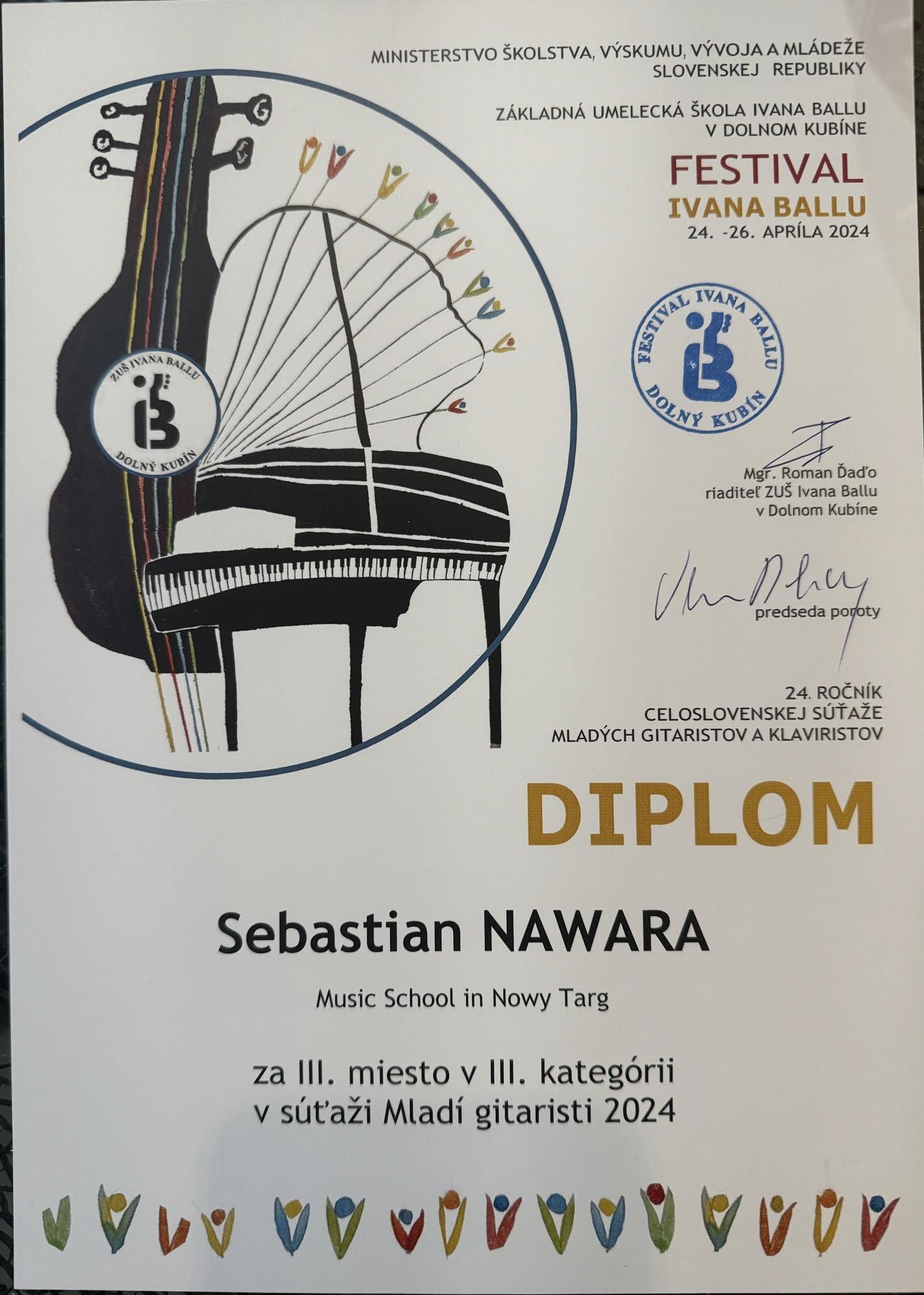 Bardzo nam miło przekazać wspaniałe wieści, które dotarły do nas ze Słowacji: Sebastian Nawara zajął III miejsce podczas Międzynarodowego Konkursu Gitarowego "Mladi gitaristi 2024" w Dolnym Kubinie (Słowacja, 24-26 kwietnia 2024 r.).