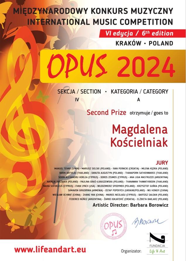 Z przyjemnością informujemy, że uczniowie klasy gitary Pani Jadwigi Wołek otrzymali nagrodę i wyróżnienie na MIĘDZYNARODOWYM KONKURSIE MUZYCZNYM OPUS 2024 - KRAKÓW - POLSKA - VI edycja (online):