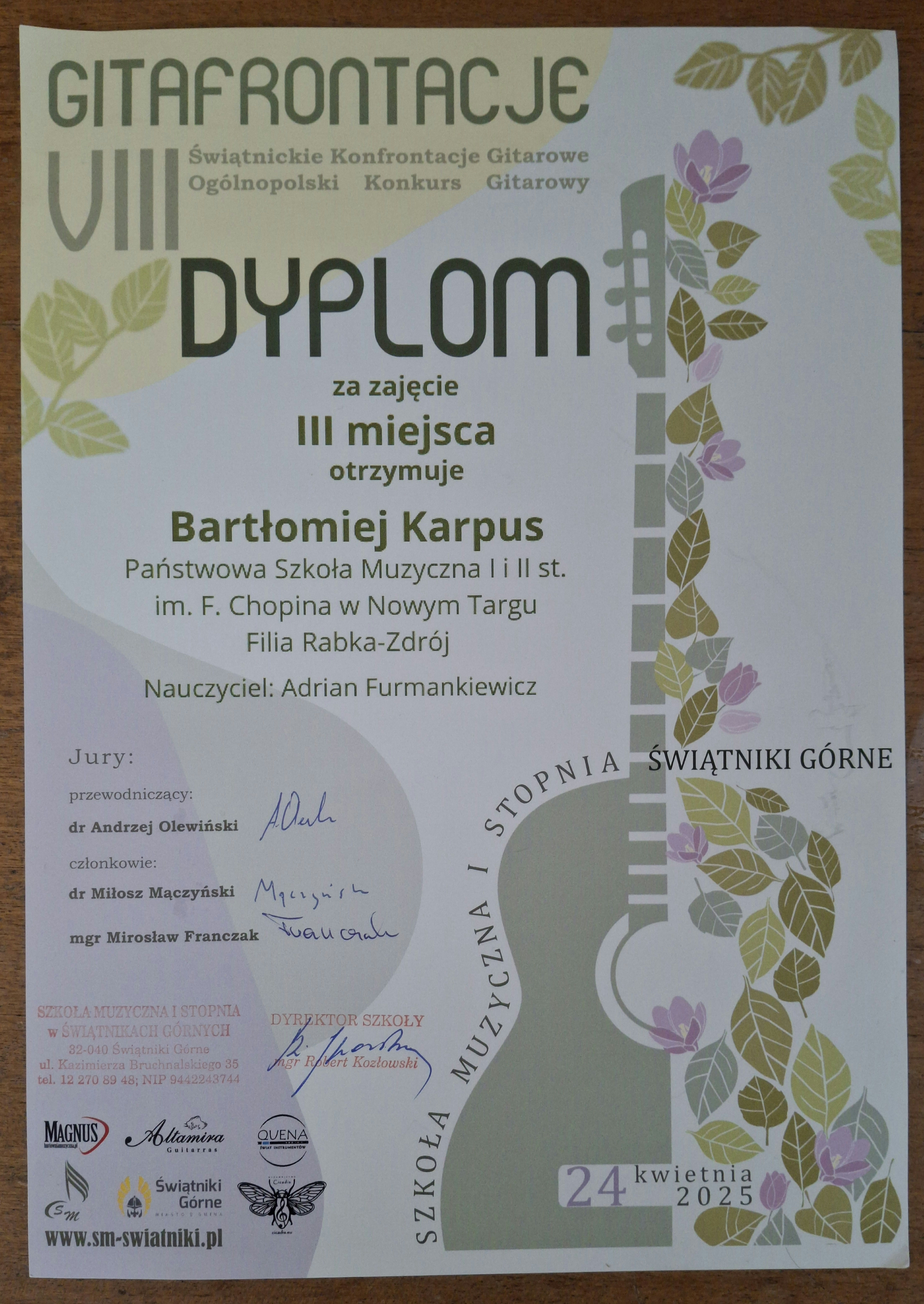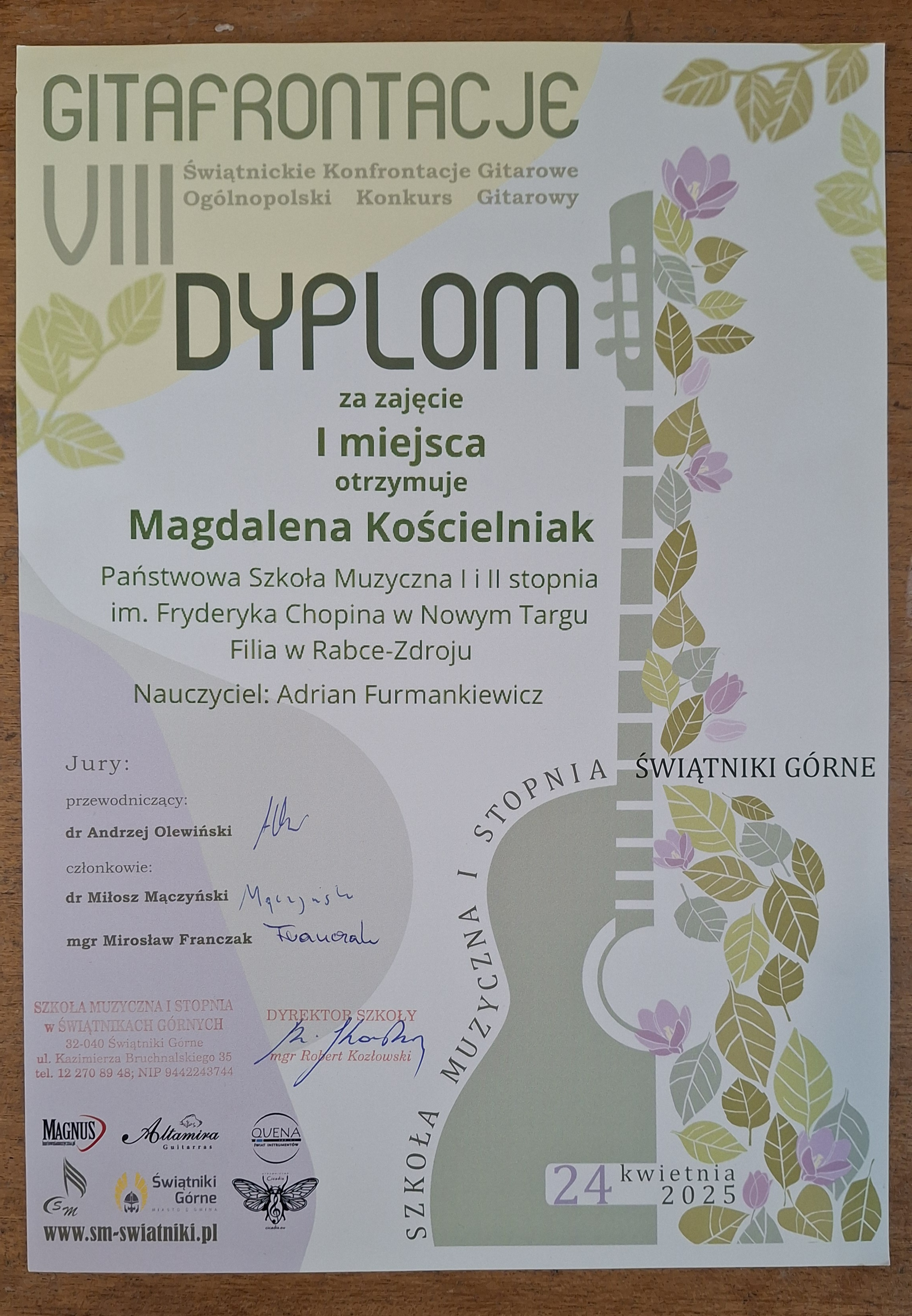 Magdalena Kościelniak zdobyła I miejsce, natomiast Bartłomiej Karpus zdobył III miejsce w grupie młodszej podczas VIII Świątnickich Konfrontacji Gitarowych "Gitafrontacji", które odbyły się 24 kwietnia 2025 r. w Świątnikach Górnych!