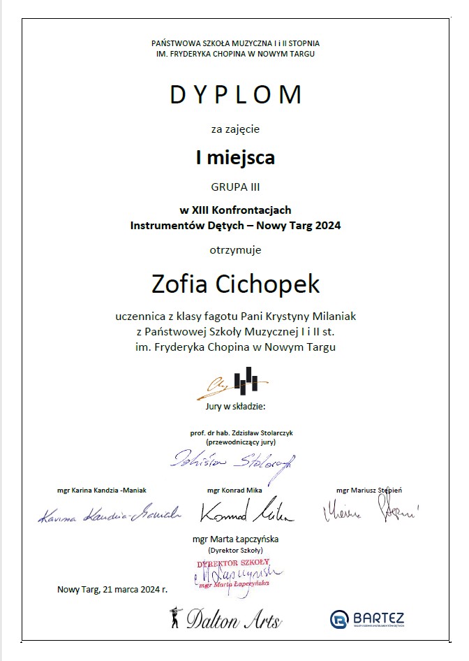 ZOFIA CICHOPEK z klasy fagotu Pani Krystyny Milaniak zajęła I miejsce ( gr. III)