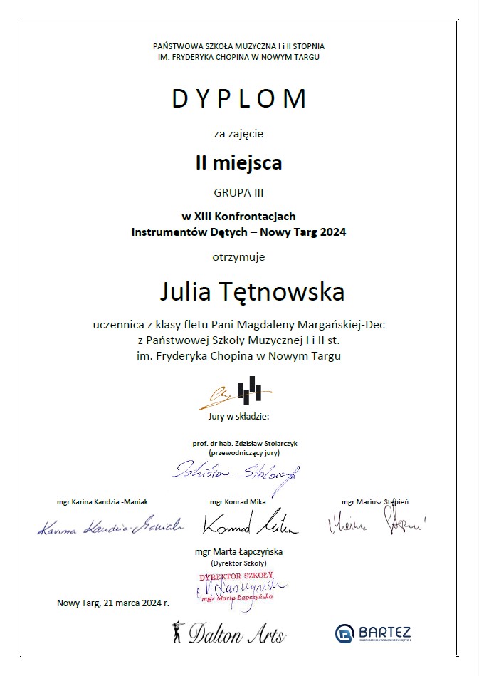 JULIA TĘTNOWSKA z klasy fletu Pani Magdaleny Margańskiej-Dec zajęła II miejsce ( gr. III)