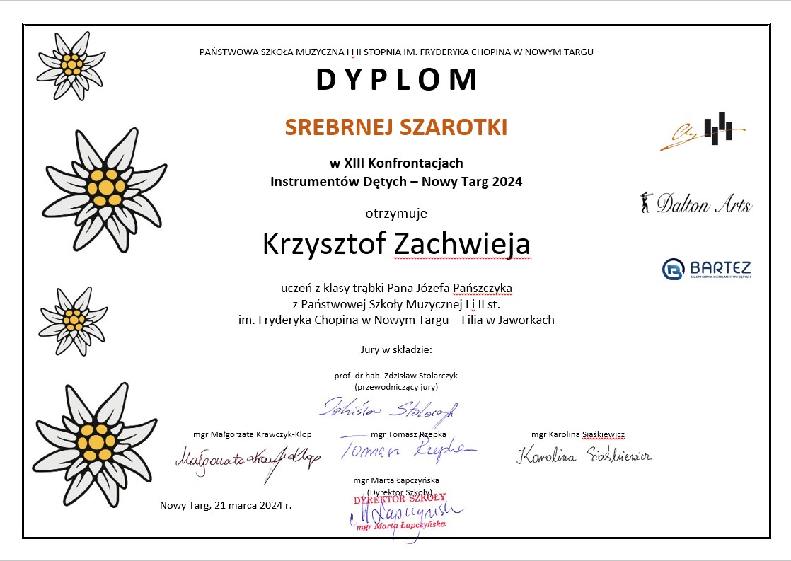 KRZYSZTOF ZACHWIEJA z klasy trąbki Pana Józefa Pańszczyka zdobył srebrną szarotkę ( gr. I )