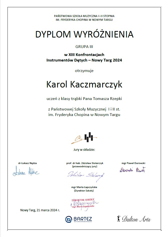 KAROL KACZMARCZYK z klasy trąbki Pana Tomasza Rzepki zdobył wyróżnienie ( gr. III )