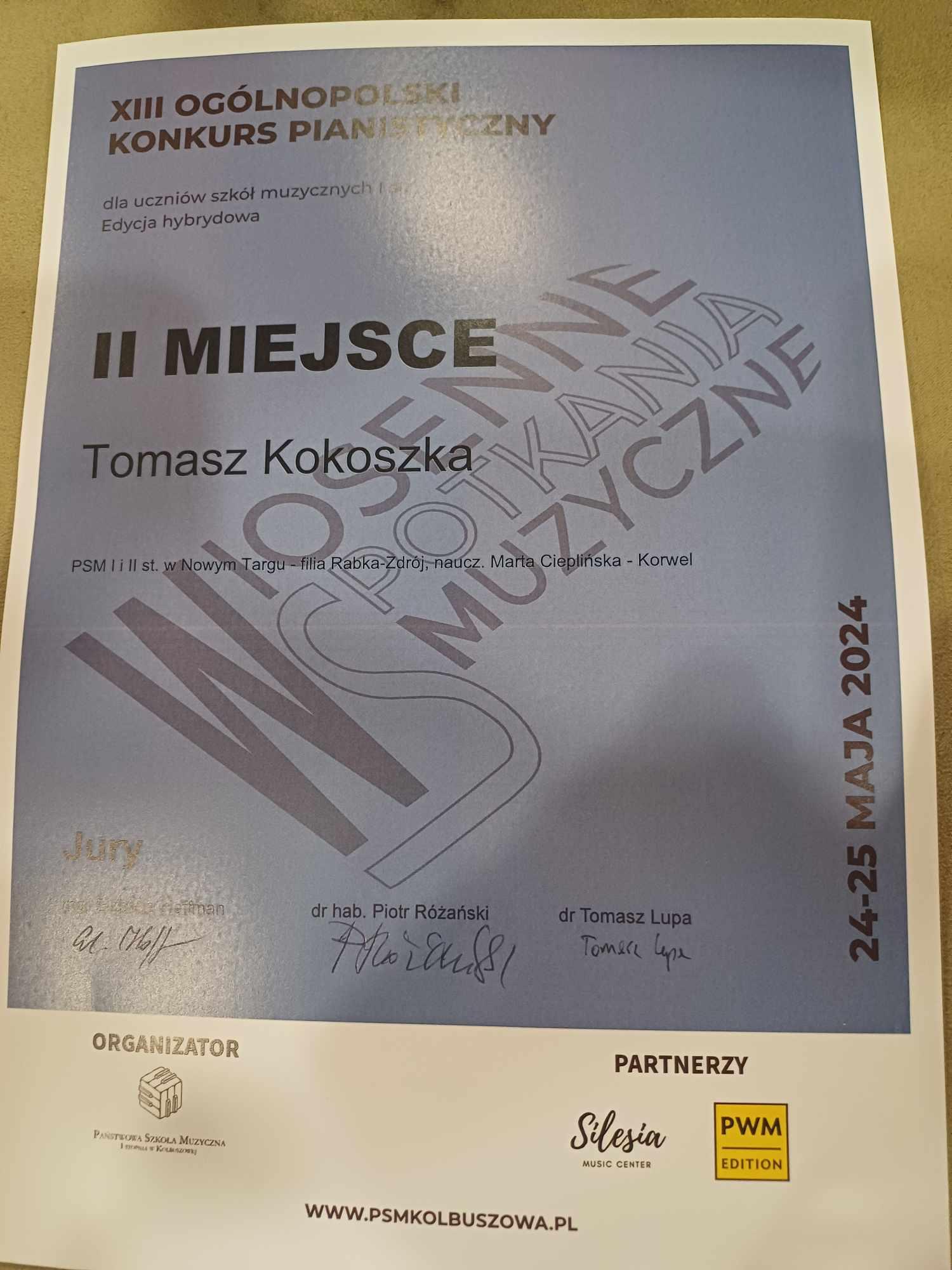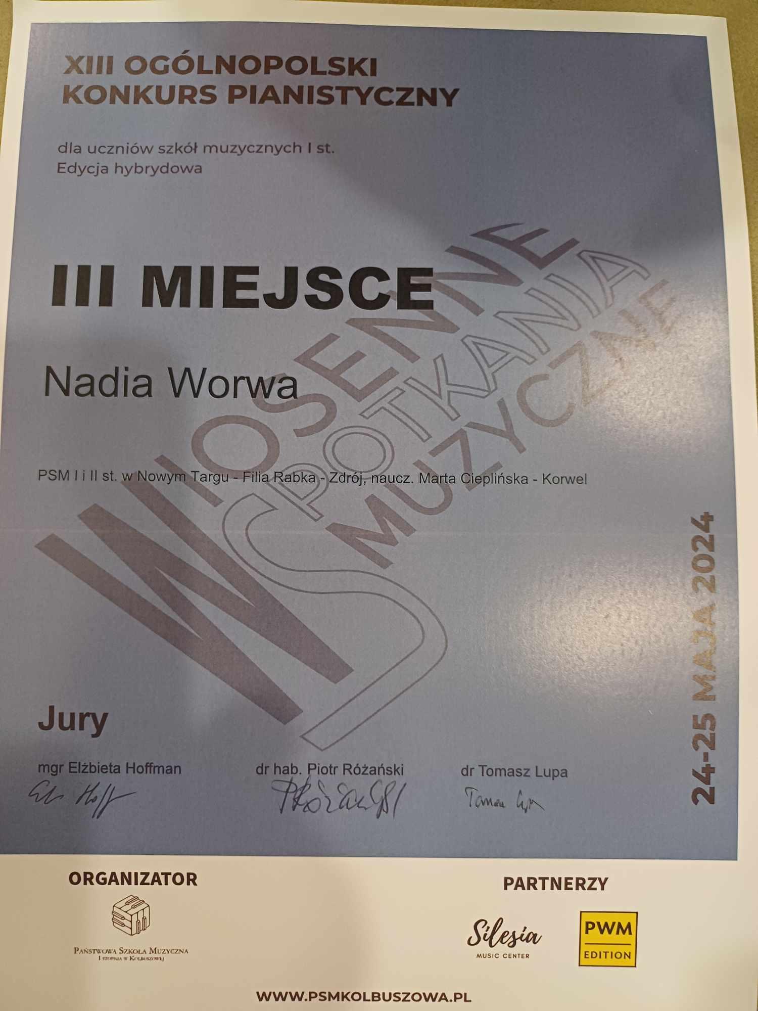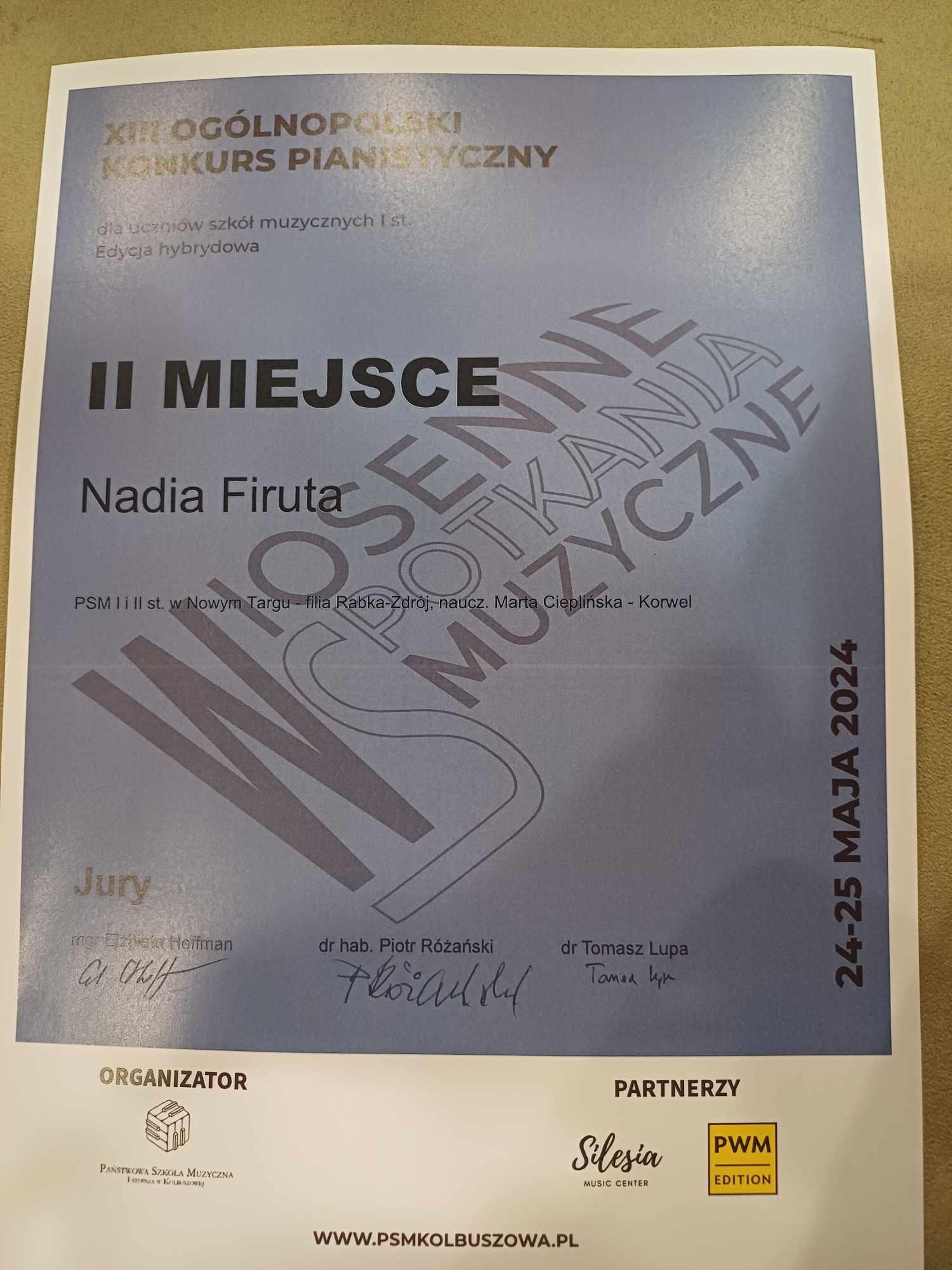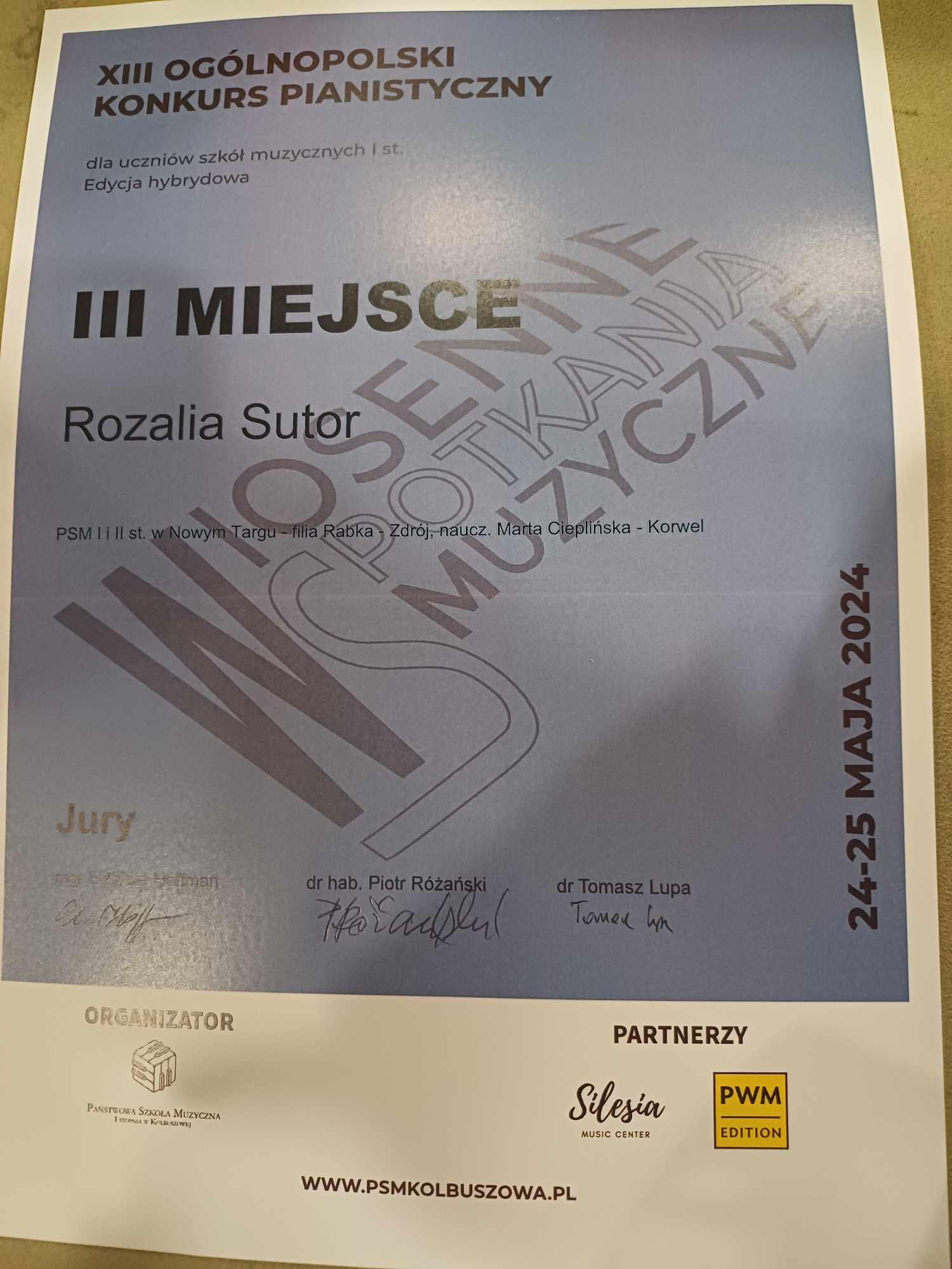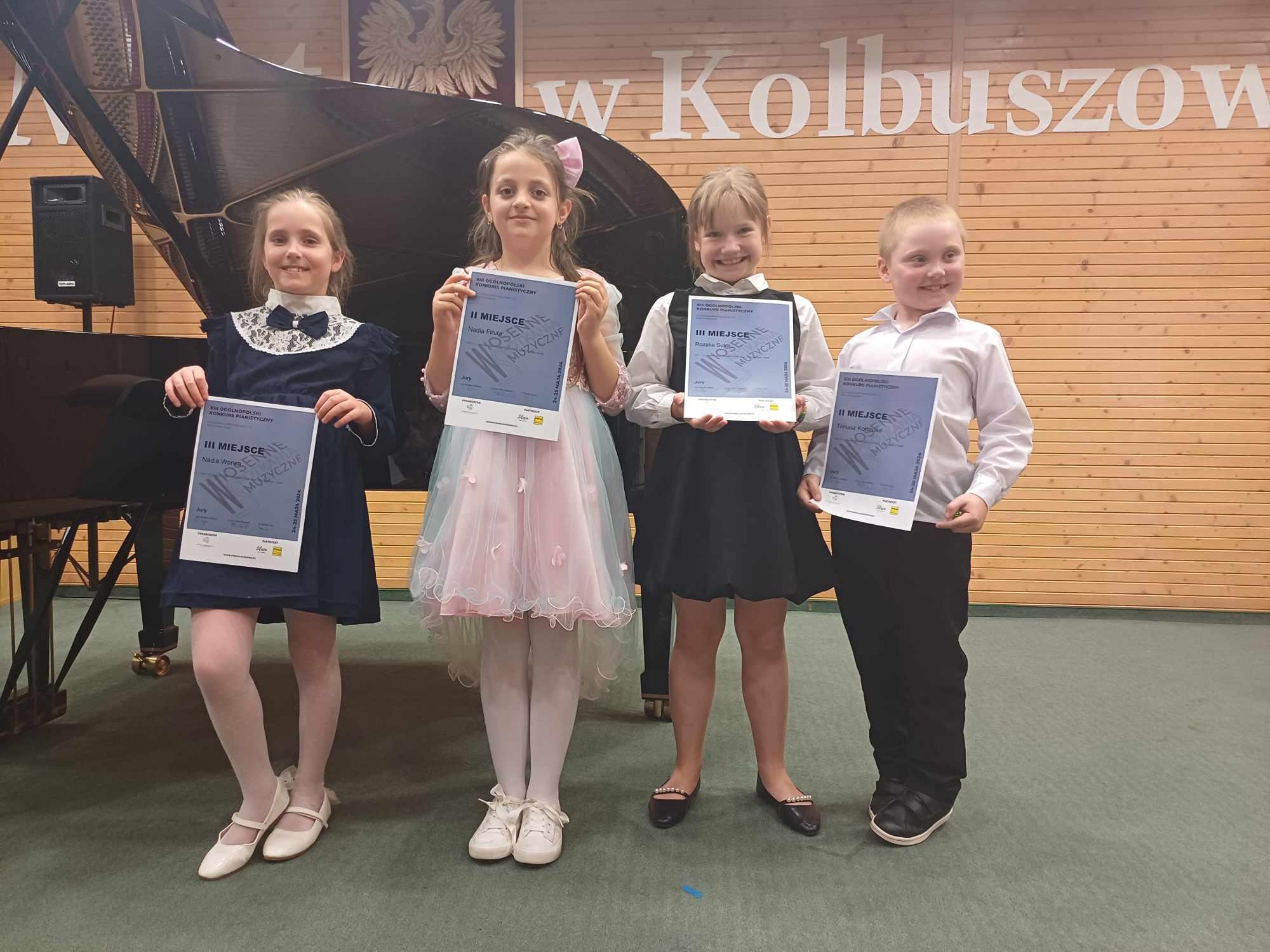 Z radością informujemy o osiągnięciach uczniów klasy fortepianu podczas XIII Wiosennych Spotkaniach Muzycznych. Konkurs Ogólnopolski w Kolbuszowej (Kolbuszowa, 24-25 maja 2024 r.):