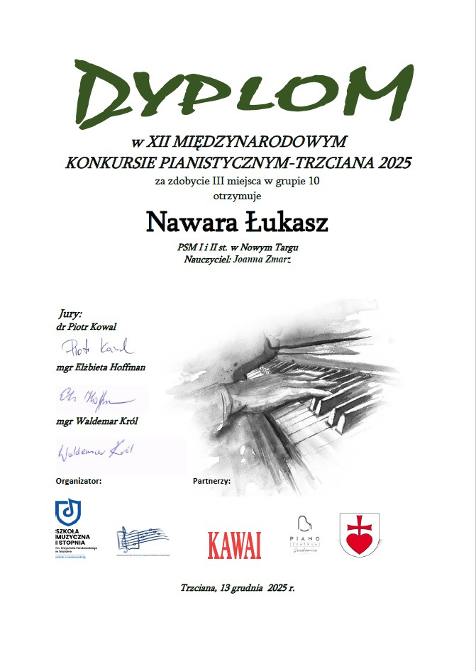 Łukaszowi Nawarze – uczniowi z klasy fortepianu Pani Joanny Zmarz – gratulujemy zdobycia III miejsca w grupie 10.