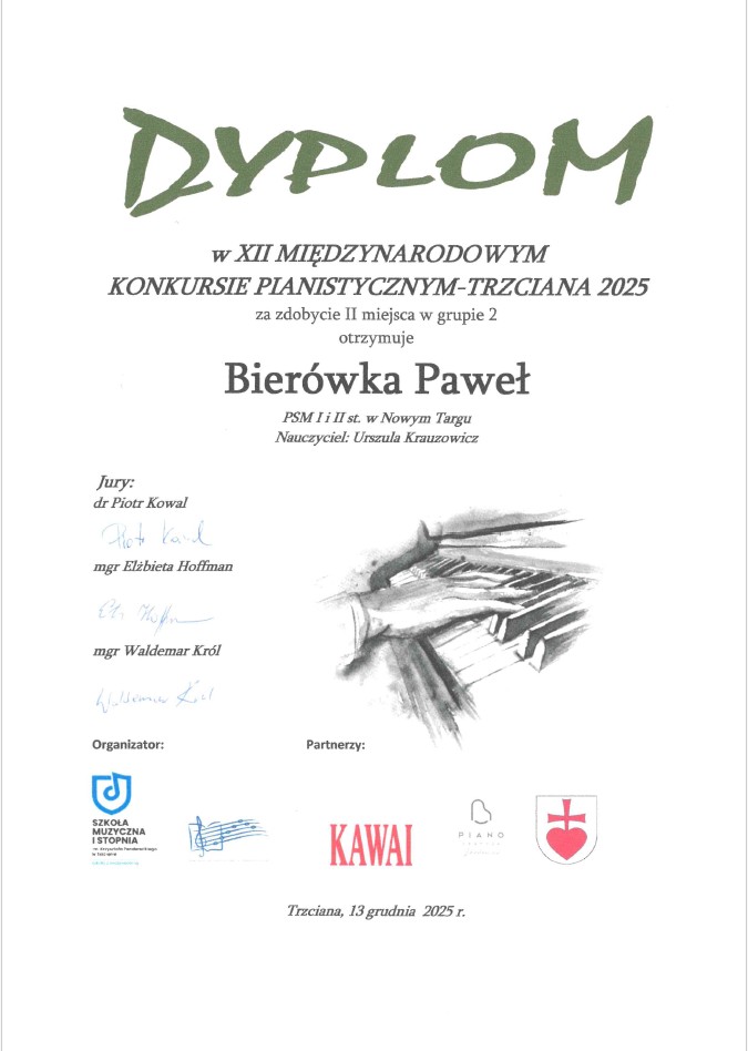 Pawłowi Bierówce – uczniowi z klasy fortepianu Pani Urszuli Krauzowicz – składamy gratulacje z okazji uzyskania II miejsca w grupie 2.