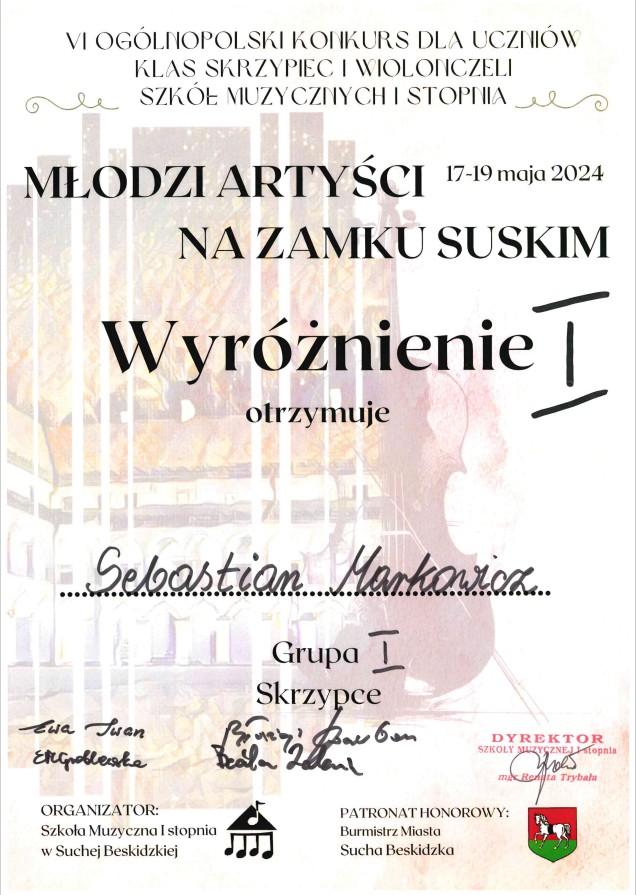 Sebastian Markowicz uczeń z klasy skrzypiec pani Katarzyna Mrożek zdobył wyróżnienie