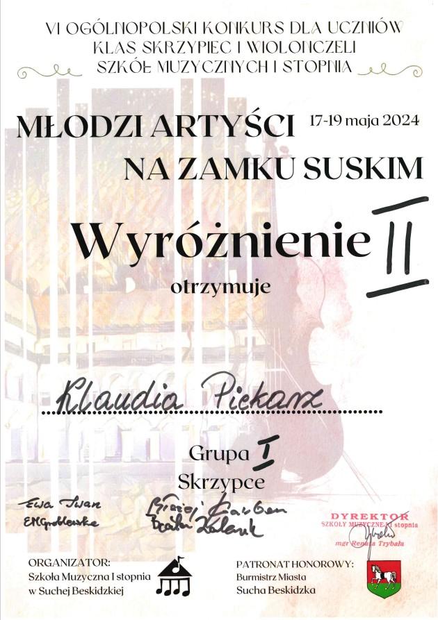 Klaudia Piekarz uczennica z klasy skrzypiec pani Karoliny Szymbary zdobyła wyróżnienie