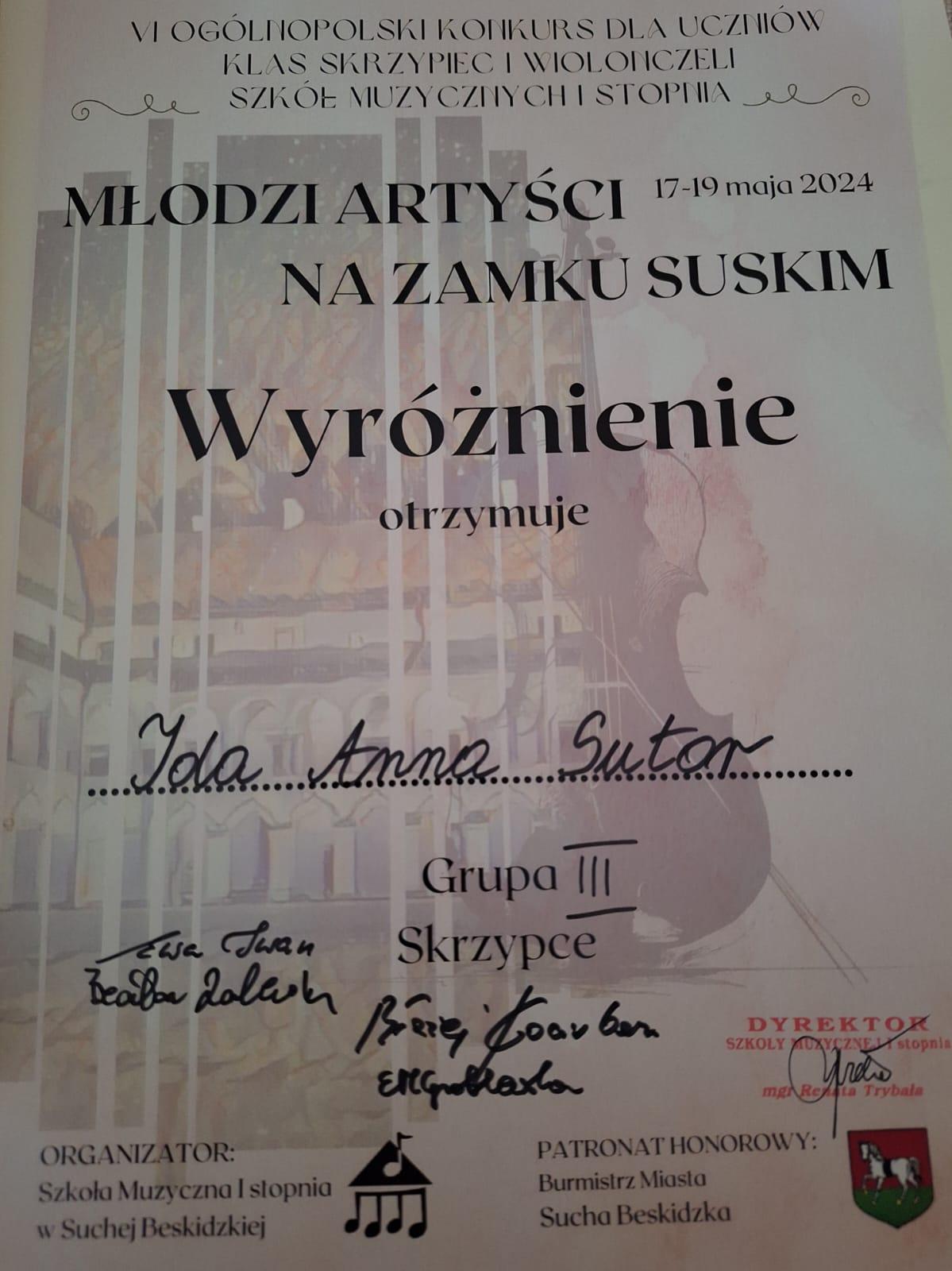 Ida Sutor uczennica z klasy skrzypiec pana Piotra Dziechciowskiego zsobyła wyróżnienie