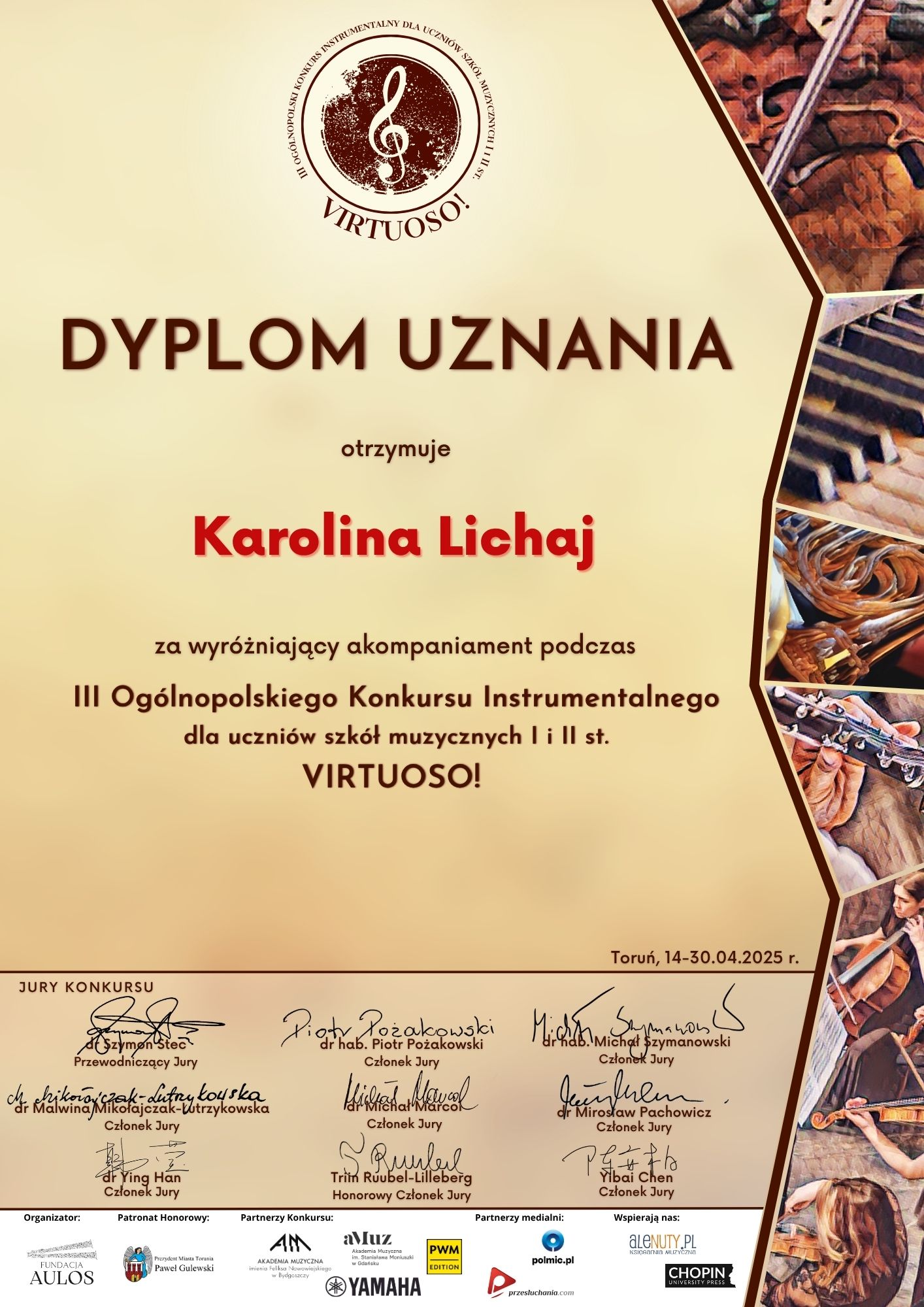 - Pani Karolinie Lichaj, za wyróżniający akompaniament, który również został uhonorowany Dyplomem Uznania!