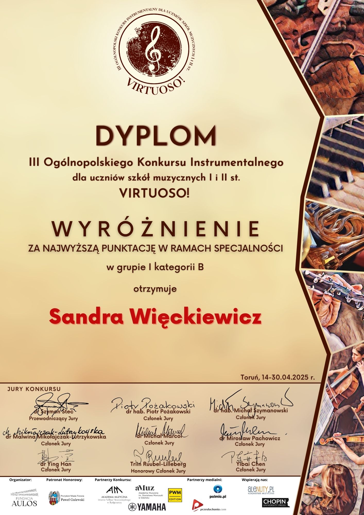 Z ogromną dumą i radością informujemy o spektakularnych osiągnięciach na prestiżowym III Ogólnopolskim Konkursie Instrumentalnym "VIRTUOSO!", który odbył się w Toruniu w dniach 14-30 kwietnia 2025 roku!