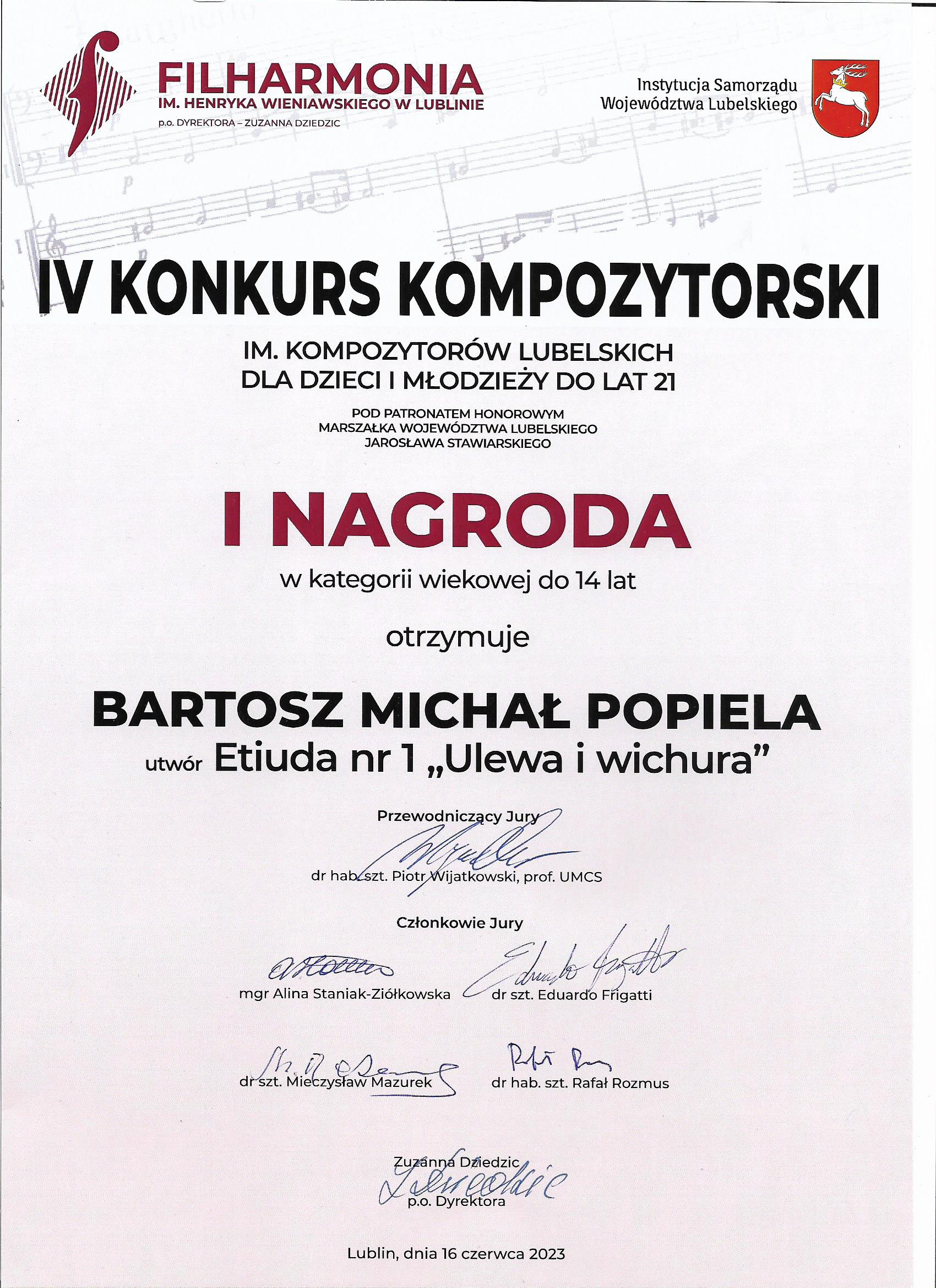 Niezmiernie miło nam poinformować, że uczeń Pana Piotra Dziechciowskiego i Pani Małgorzaty Majdy, Bartosz Popiela otrzymał Pierwszą Nagrodę w kategorii wiekowej do 14 lat w organizowanym przez Filharmonię Lubelską IV Konkursie Kompozytorskim im. Kompozytorów Lubelskich dla dzieci i młodzieży do lat 21.