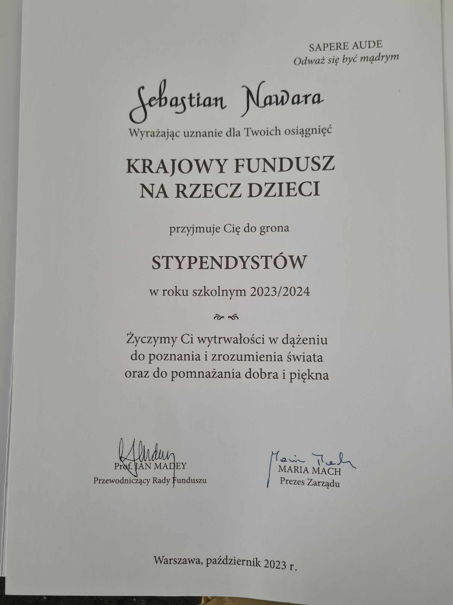 Sebastian Nawara stypendystą Krajowego Funduszu na rzecz Dzieci w roku szkolnym 2023/24