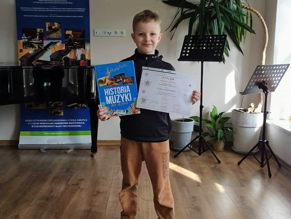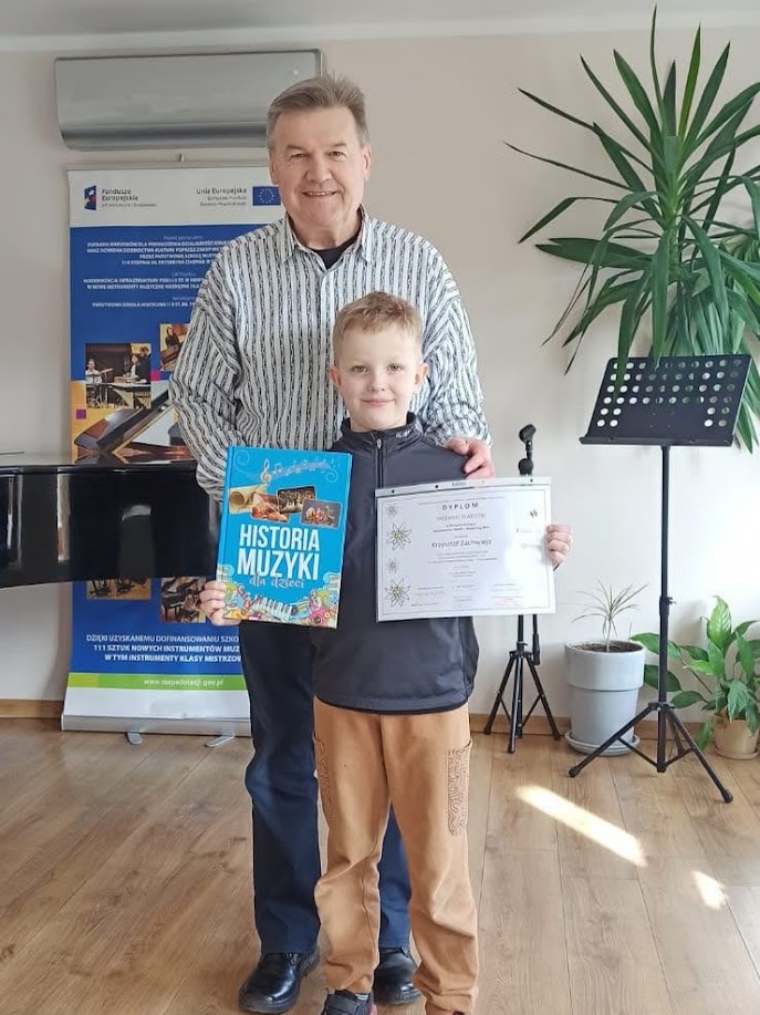 KRZYSZTOF ZACHWIEJA z klasy trąbki Pana Józefa Pańszczyka zdobył srebrną szarotkę ( gr. I )