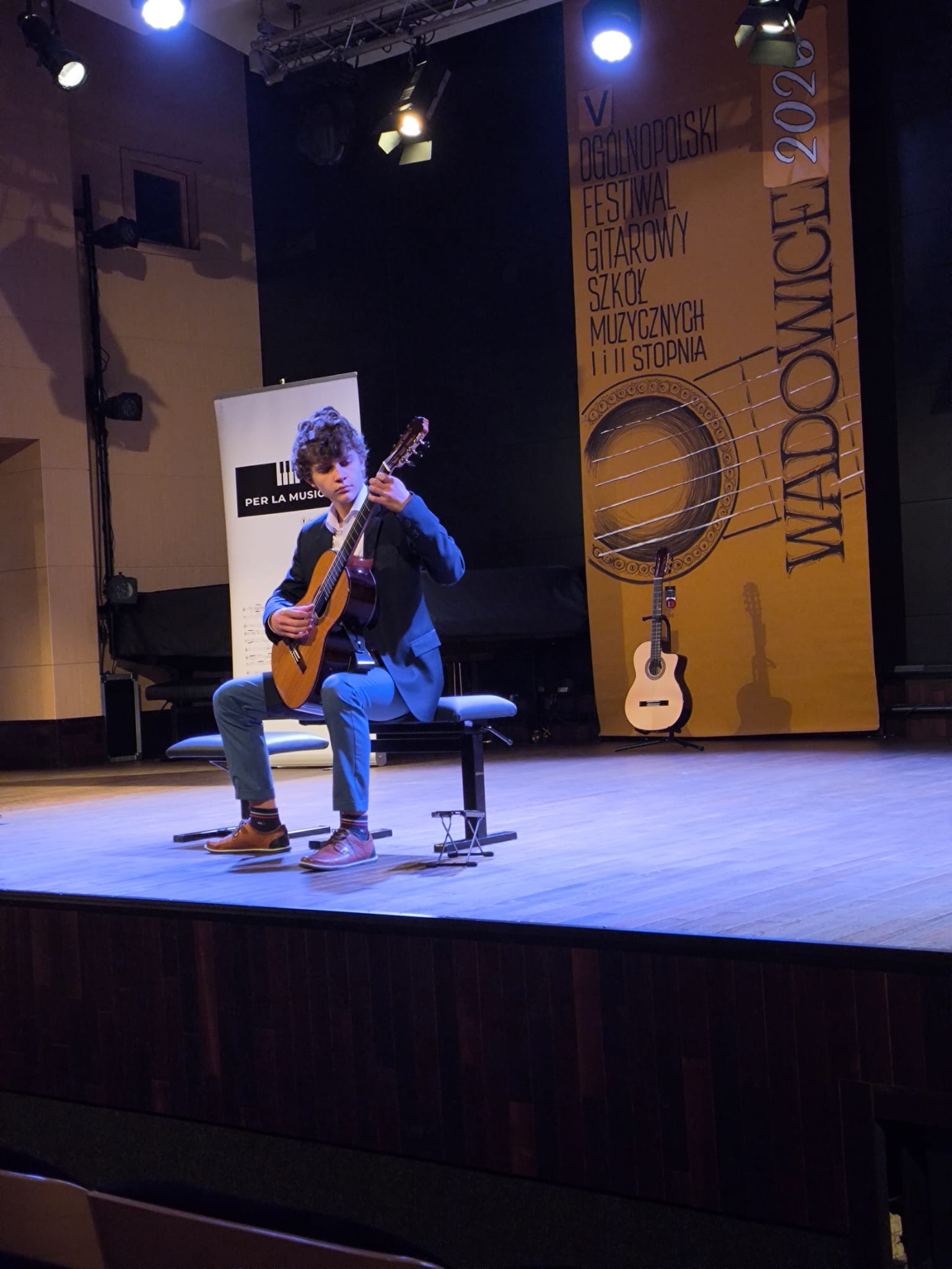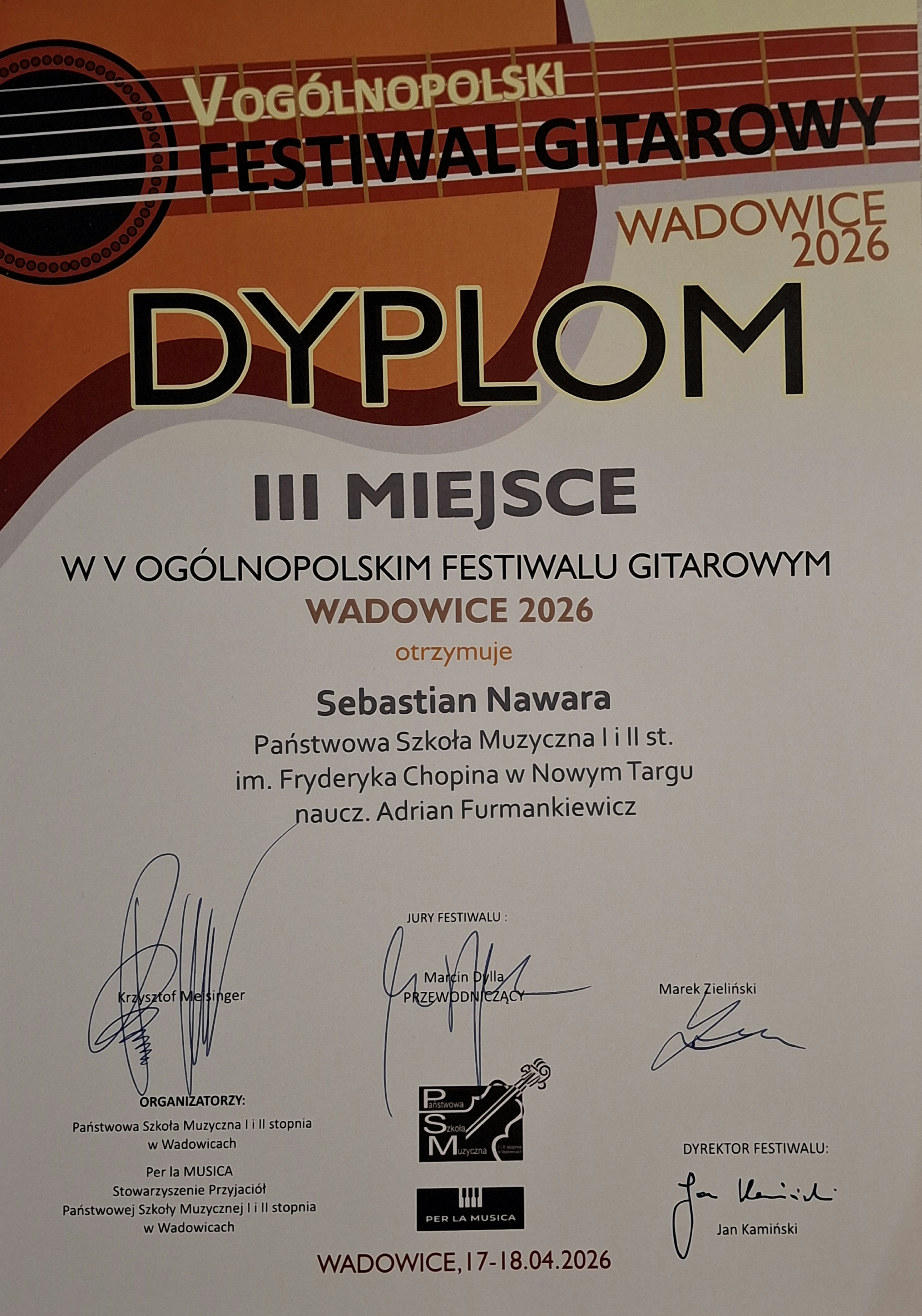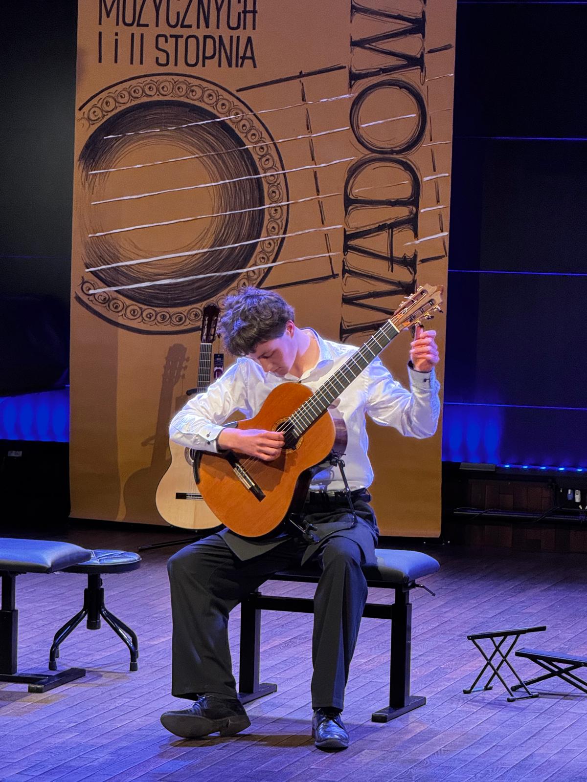 Sebastian Nawara, uczeń z klasy gitary Pana Adriana Furmankiewicza, zdobył III miejsce w grupie IV podczas V Ogólnopolskiego Konkursu Gitarowego w Wadowicach! Konkurs odbywał się w dniach 17-19 kwietnia 2026 r.