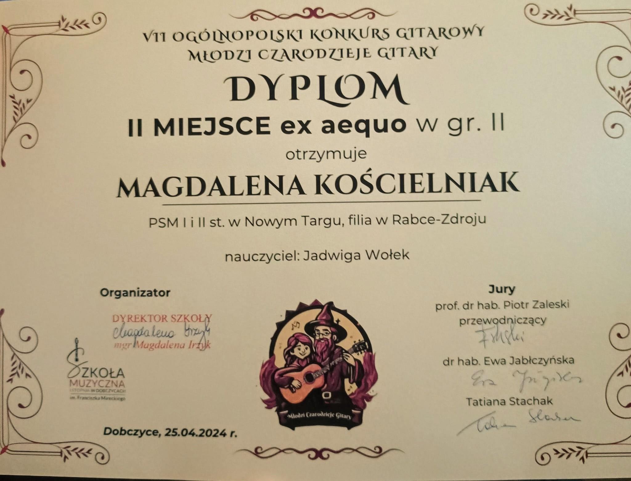 Troje uczniów gitary z filii w Rabce- Zdroju wzięło udział w VII Ogólnopolskim Konkursie Gitarowym "Młodzi czarodzieje gitary" w Dobczycach, w którym padła rekordowa liczba uczestników 65 z 32 szkół z całej Polski. Nasi niezawodni młodzi Czarodzieje Gitary w niezwykle trudnej konkurencji, wyczarowali ze swoich instrumentów następujące nagrody: