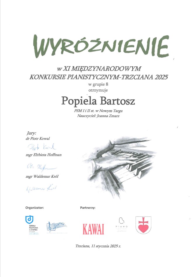 Bartosz Popiela uczeń z klasy fortepianu Pani Joanny Zmarz – wyróżnienie