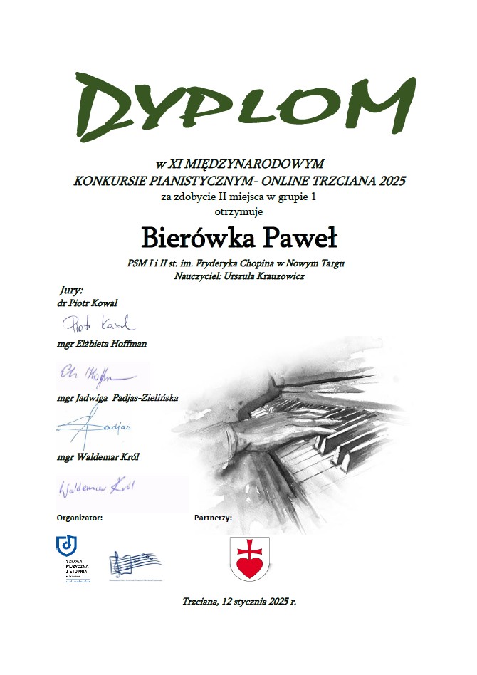 Paweł Bierówka uczeń z klasy fortepianu Pani Urszuli Krauzowicz – II miejsce