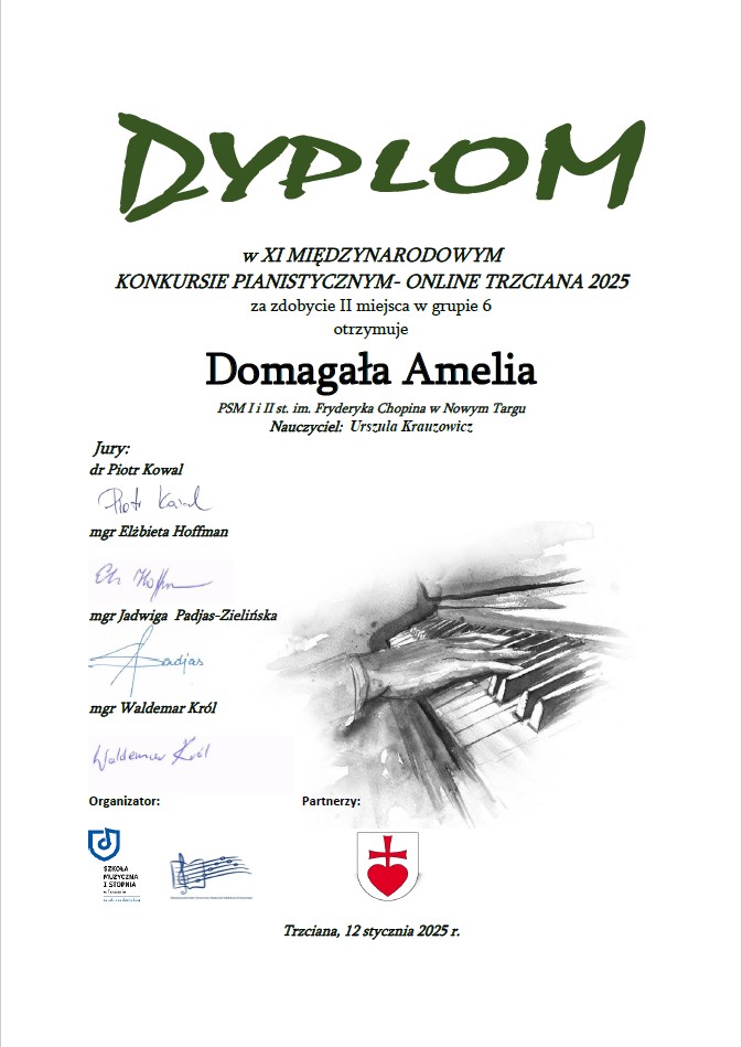 Amelia Domagała uczennica z klasy fortepianu Pani Urszuli Krauzowicz – II miejsce