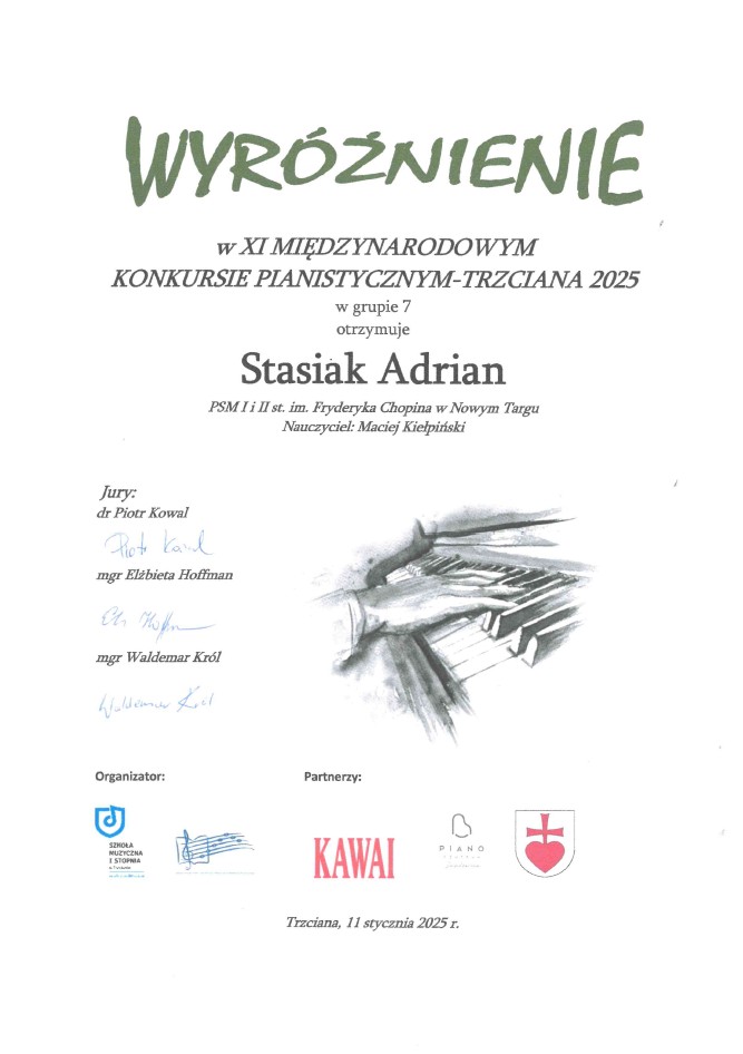 Adrian Stasiak uczeń z klasy fortepianu Pana Macieja Kiełpińskiego - wyróżnienie