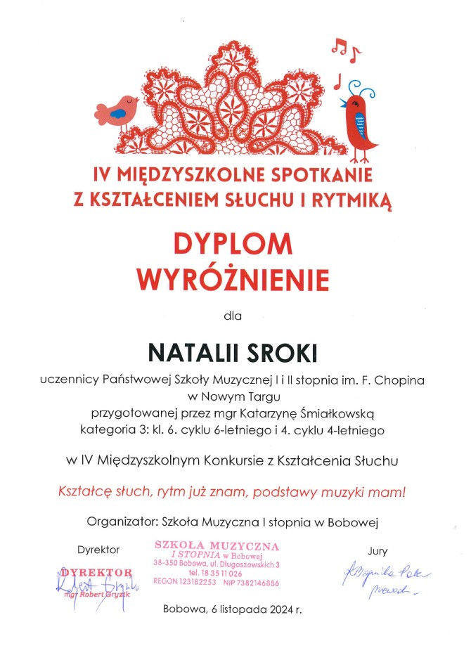 Sroka Natalia z klasy kształcenia słuchu Pani Katarzyny Śmiałkowskiej otrzymała wyróżnienieGratulujemy