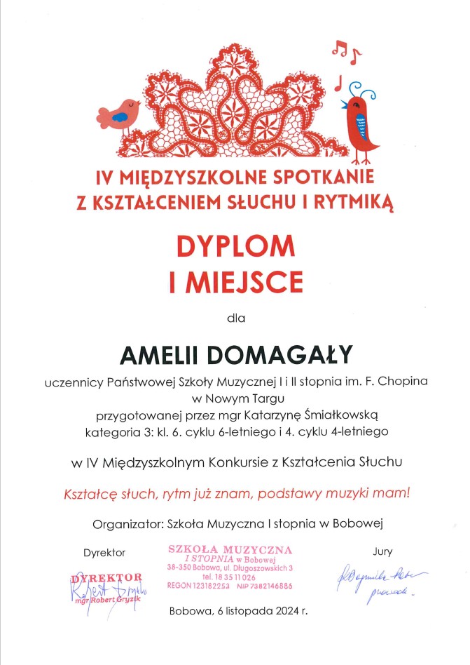 Amelia Domagała z klasy kształcenia słuchu Pani Katarzyny Śmiałkowskiej zajęła I miejsce
