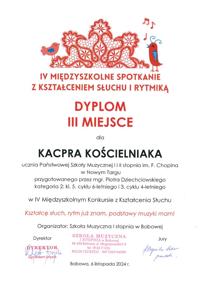 Z radością informujemy o sukcesach naszych uczniów uzyskane podczas IV Międzyszkolnego Konkursu z Kształcenia Słuchu w Bobowej