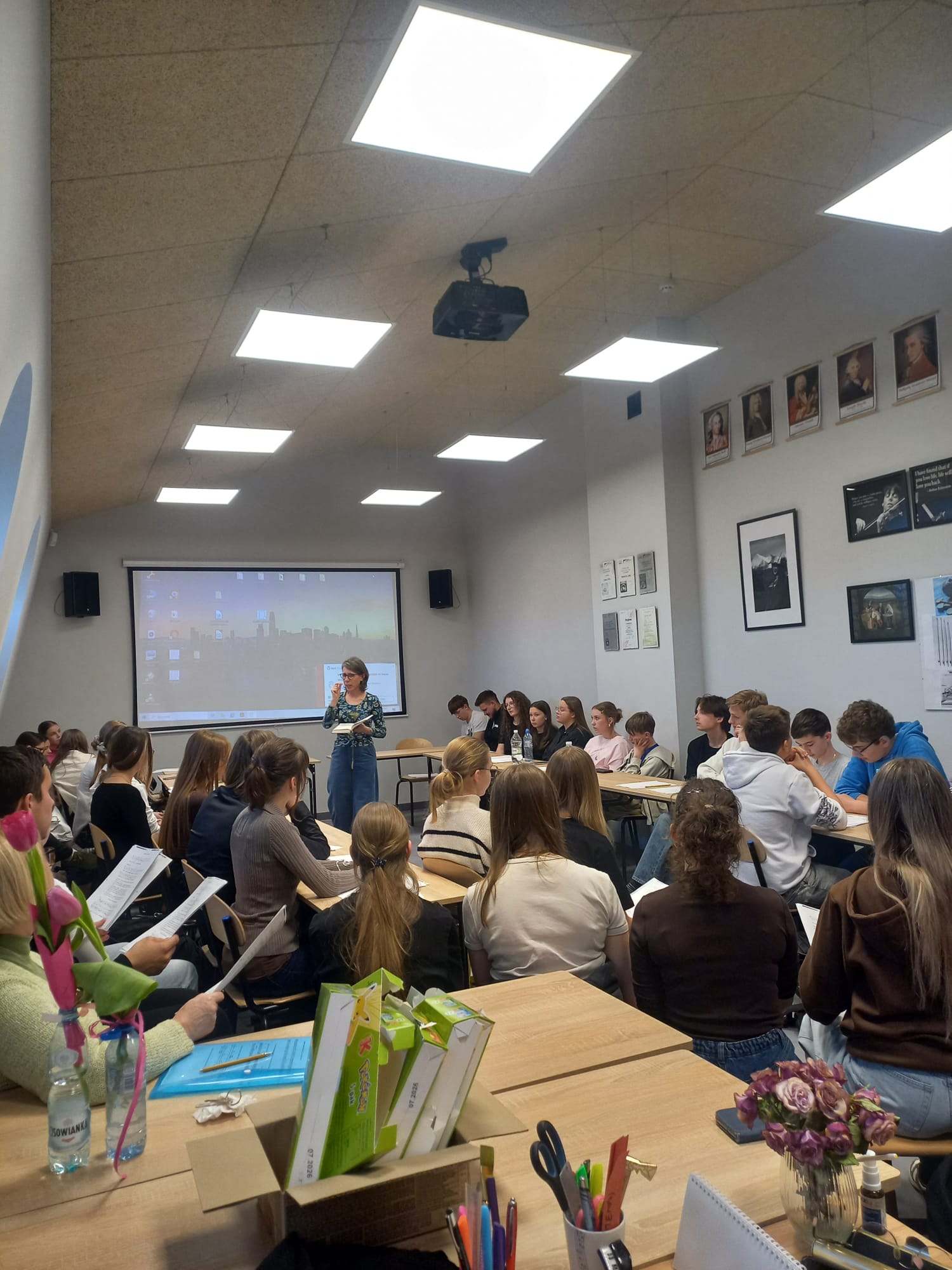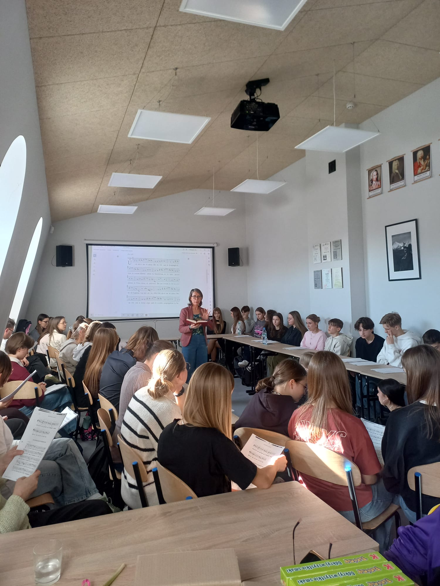Prof. Susi Ferfoglia dzieliła się wiedzą w sposób interaktywny, angażując dużą grupę młodzieży. Zajęcia obejmowały zarówno wykład wprowadzający, jak i wspólną analizę partytur.