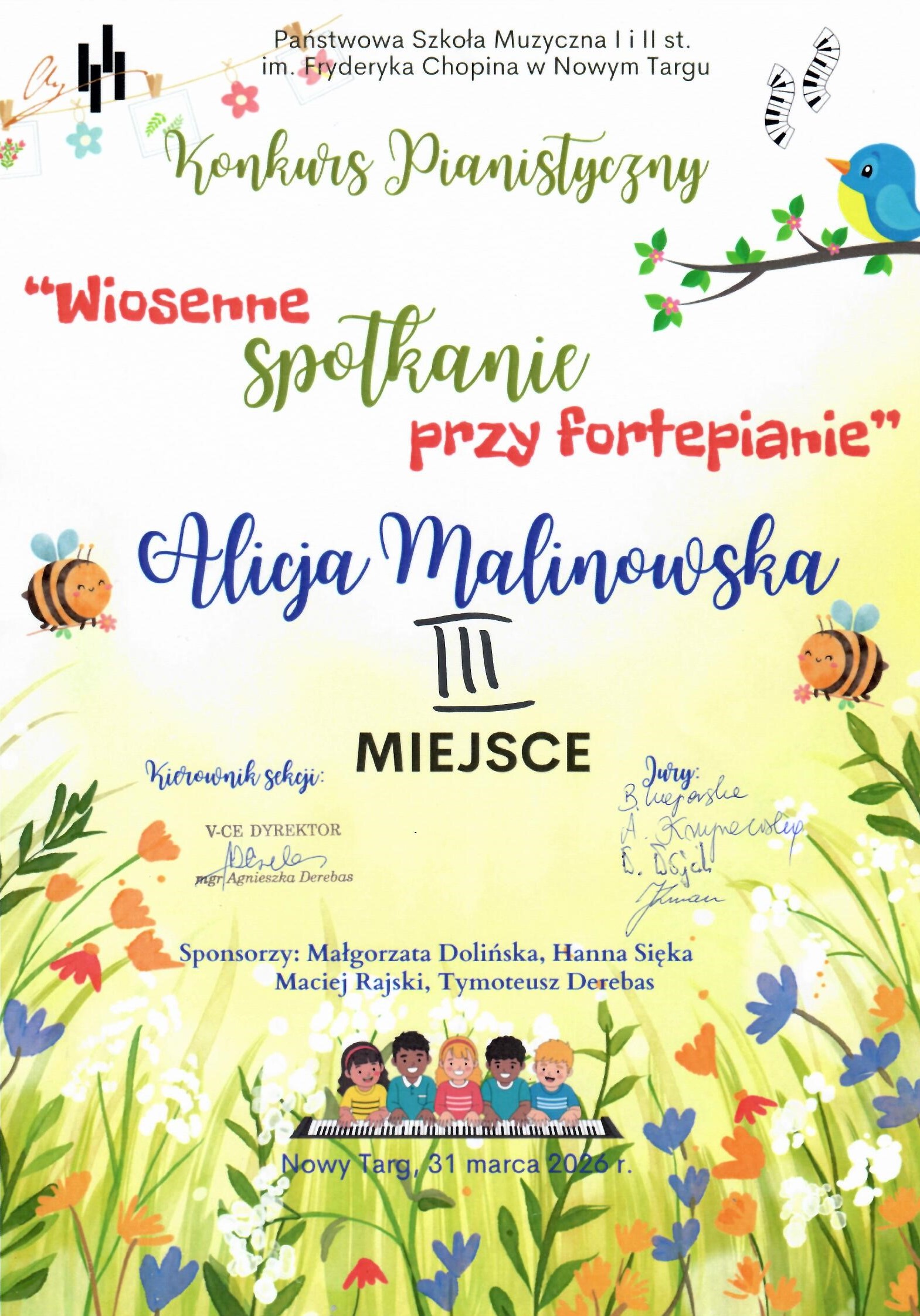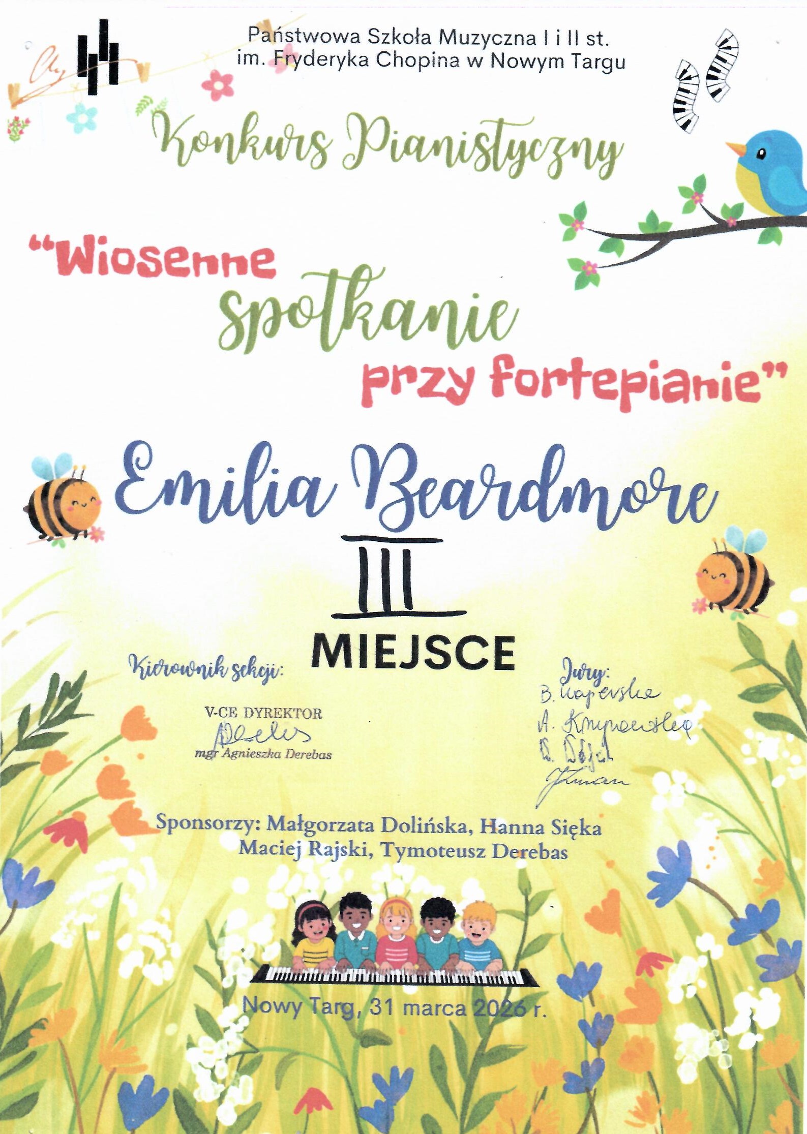 31 marca 2026 r. w PSM w Nowym Targu odbył się konkurs pianistyczny dla najmłodszych pt. "Wiosenne spotkanie przy fortepianie". W tym wydarzeniu wzięły udział dwie nasze uczennice z klasy drugiej - Alicja Malinowska i Emilia Beadrmore, które z ogromnym zaangażowaniem przygotowywały się do tego występu. Obie uczennice zdobyły trzecie miejsca w swoich kategoriach, co jest dużym osiągnięciem i powodem do radości.