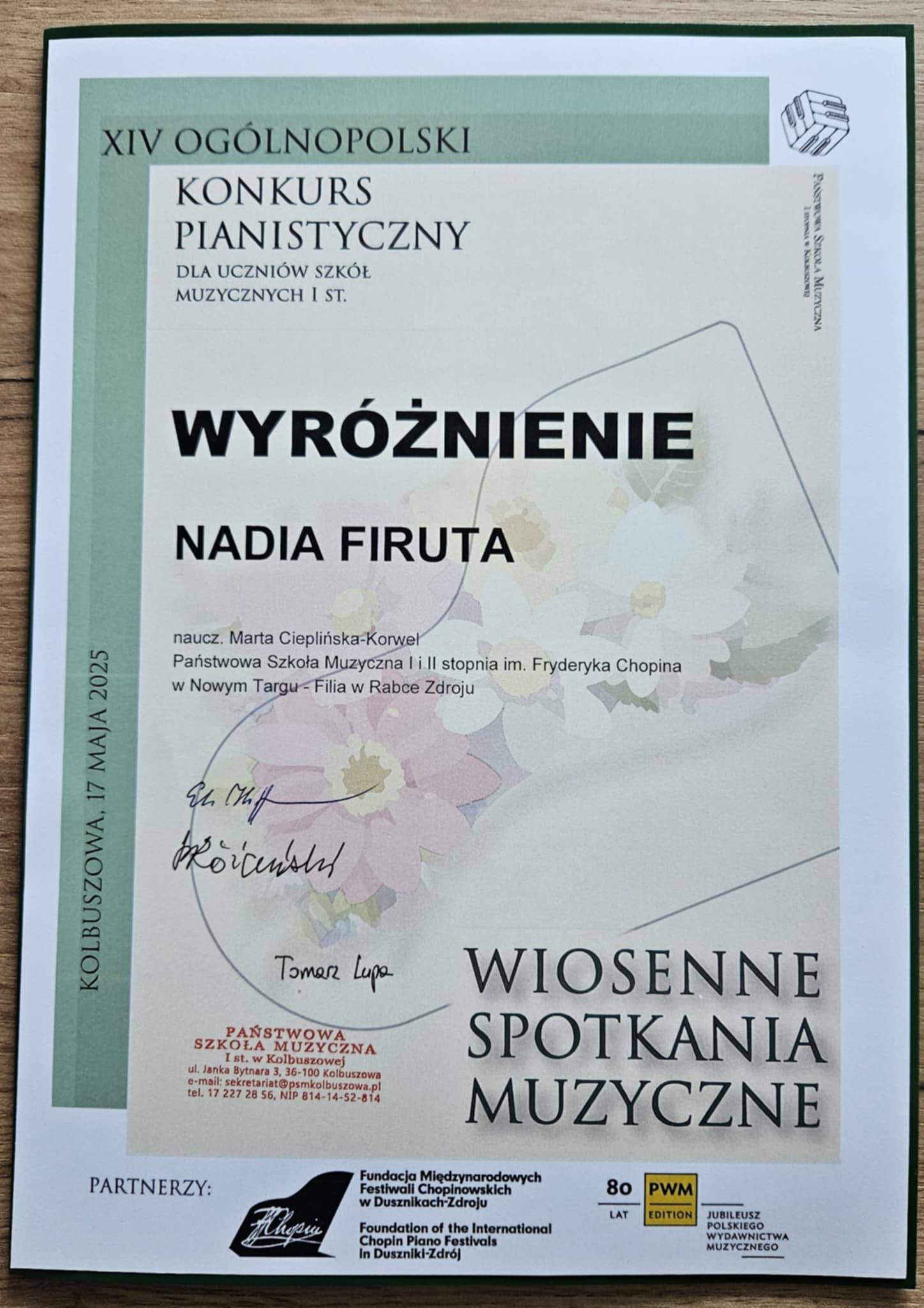 Z ogromną radością i dumą składamy serdeczne gratulacje Nadii Firucie i Nadii Worwie dla uczennic klasy fortepianu Pani Marty Cieplińskiej-Korwel za zdobycie wyróżnień podczas XIV Ogólnopolskiego Konkursu Pianistycznego „Wiosenne Spotkania Muzyczne” w Kolbuszowej.