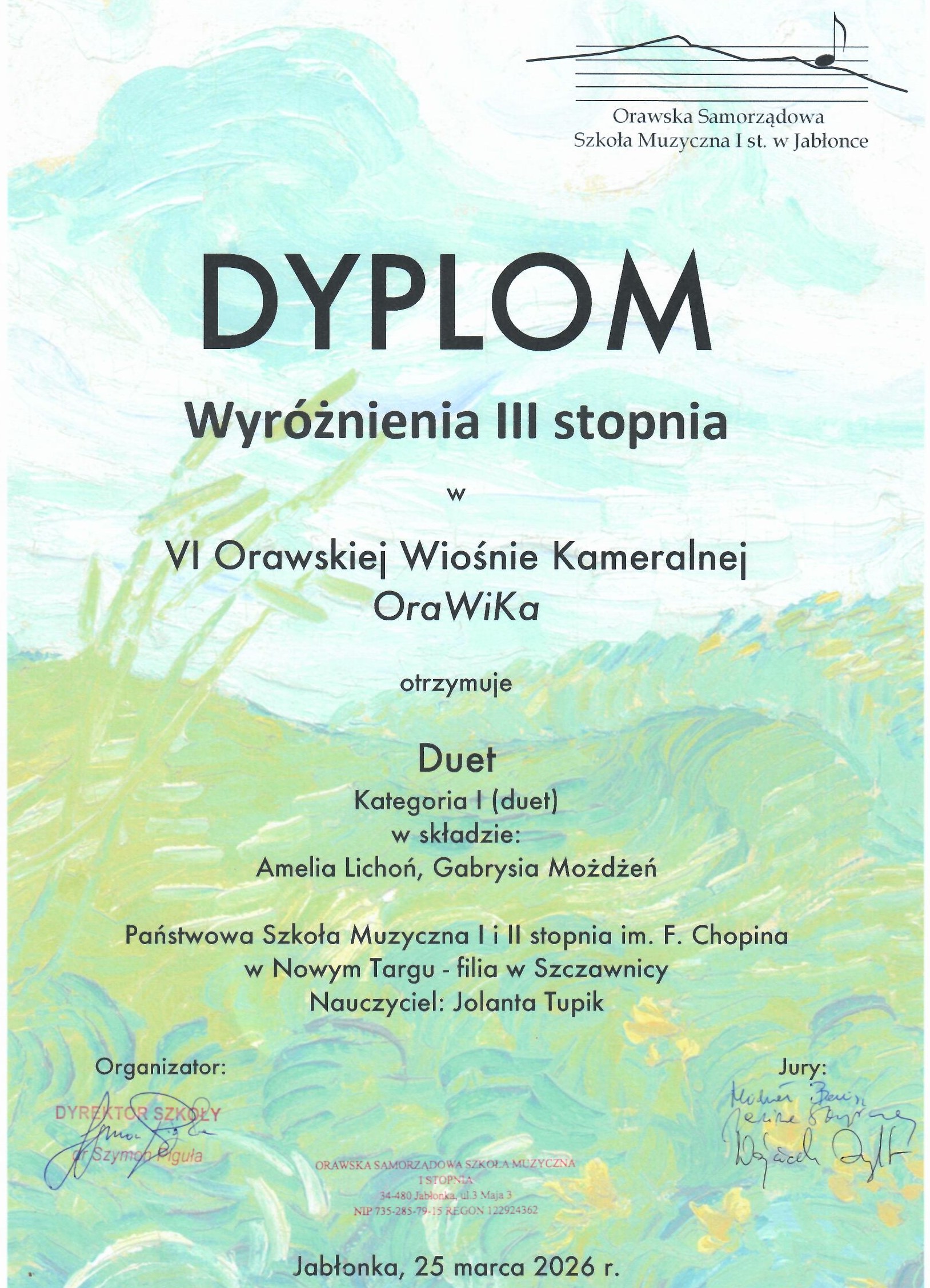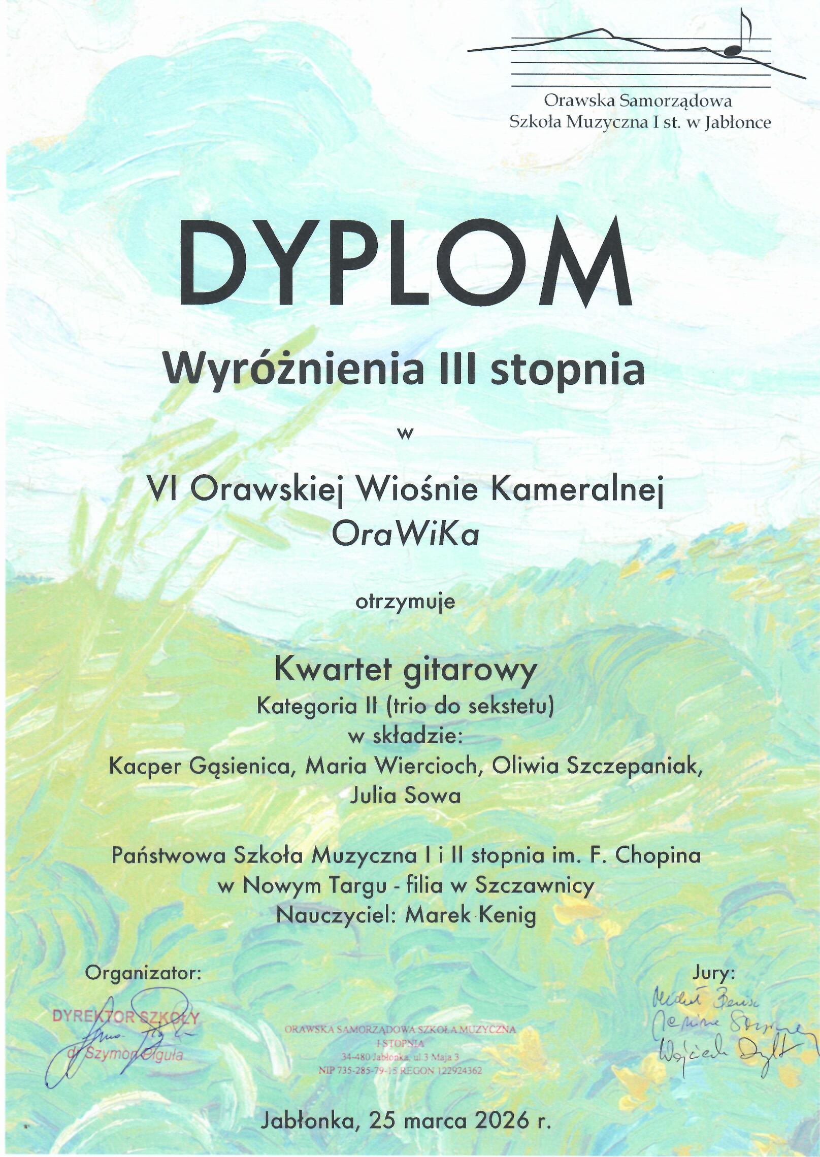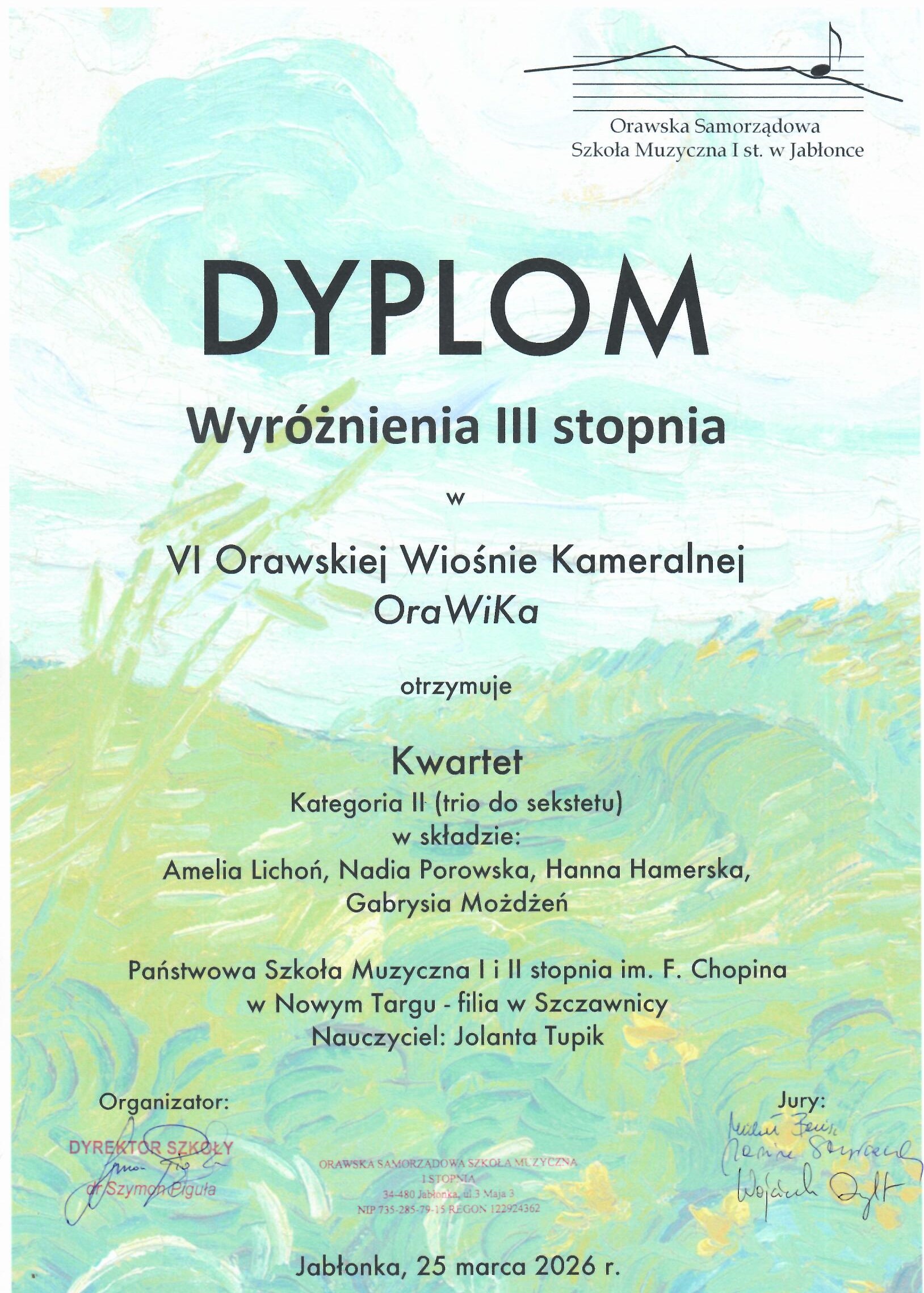 25 marca 2026 r. odbyła się VI Orawska Wiosna Kameralna – OraWiKa 2026 w której pięknie zaprezentowały się trzy zespoły z naszej szkoły: