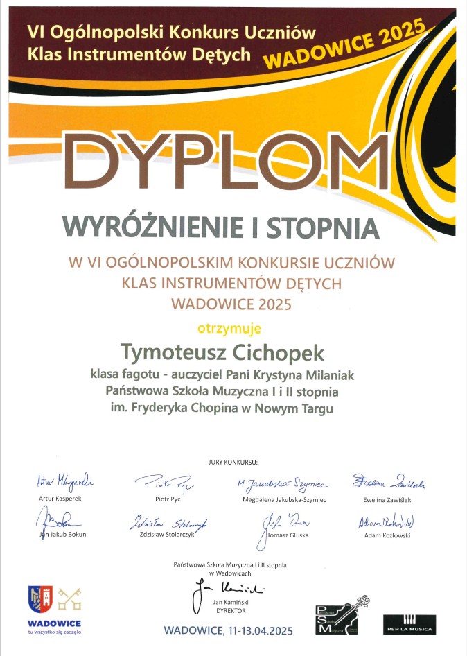 Z ogromną radością informujemy, że Zofia Cichopek oraz Tymoteusz Cichopek, uczniowie klasy fagotu Pani Krystyny Milaniak, zdobyli Wyróżnienia I stopnia