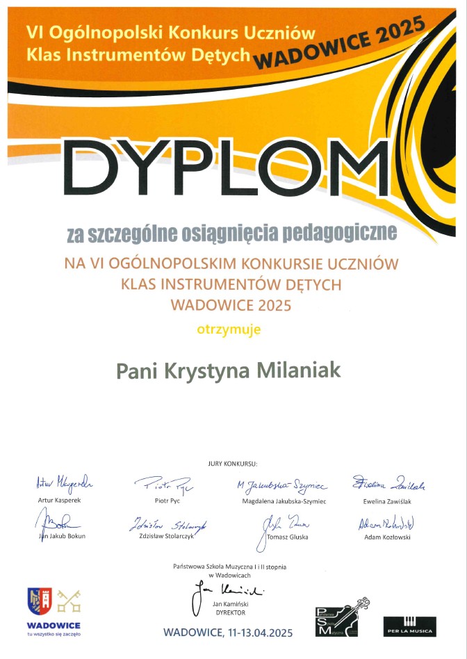 To wspaniałe osiągnięcie jest dowodem talentu, ciężkiej pracy i muzycznej wrażliwości naszych młodych instrumentalistów oraz zaangażowania ich nauczycielki.