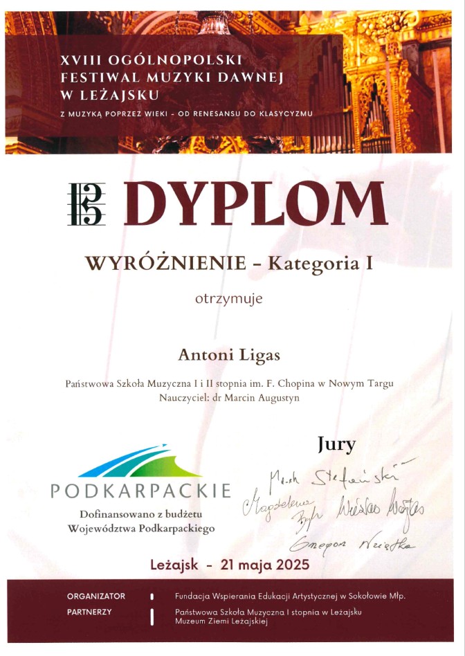 Z ogromną radością i dumą informujemy o wyjątkowym osiągnięciu naszego utalentowanego ucznia, Antoniego Ligasa z Państwowej Szkoły Muzycznej I i II stopnia im. F. Chopina w Nowym Targu! Antoni zdobył Wyróżnienie w Kategorii I na prestiżowym XVIII Ogólnopolskim Festiwalu Muzyki Dawnej w Leżajsku, który odbył się 21 maja 2025 roku.