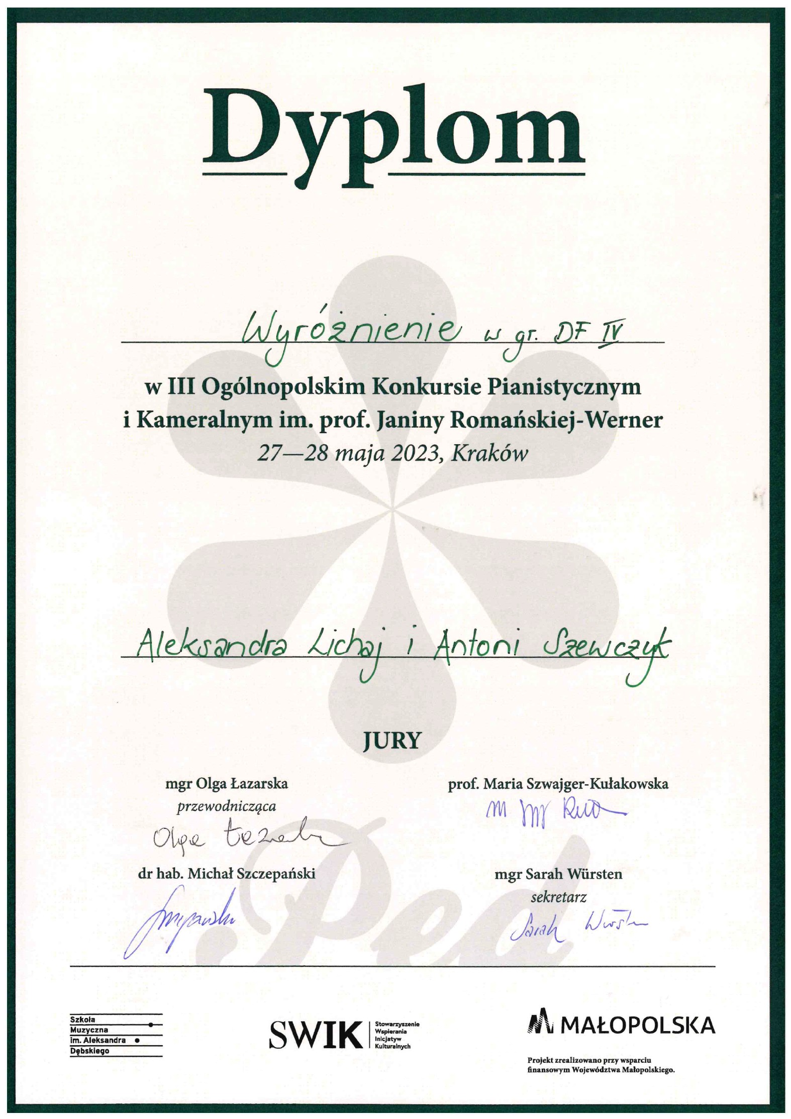 Z radościa informujemy, że duet pianistyczny w składzie Aleksandra Lichaj, Antoni Szewczyk przygotowany przez Pana Macieja Kiełpińskiego zdobył wyróżnienie podczas III Ogólnopolskiego Konkursu Pianistycznego i Kameralnego im. prof. Janiny Romańskiej-Werner (Kraków, 27-28 maja 2023 r.). Gratulujemy!!!