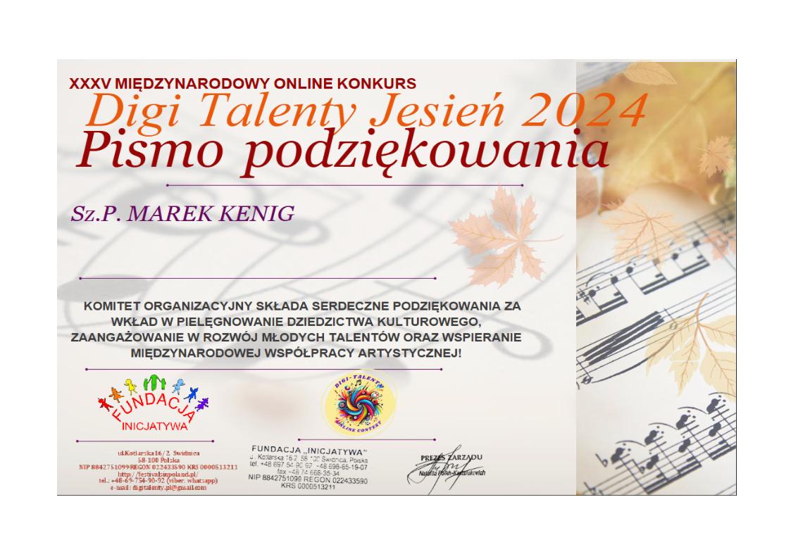Z radością informujemy, że Kacper Gąsienica z klasy gitary Pana Marka Keniga zdobył wyróżnienie podczas XXXV Międzynarodowego Konkursu Digi-Talenty Jesień 2024 ( on-line) w Świdnicy. Gratulujemy !!!