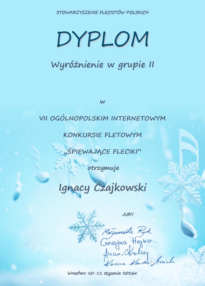 Życzymy dalszych sukcesów, nieustannego rozwoju muzycznego, wielu radosnych chwil podczas gry na flecie oraz kolejnych nagród i wyróżnień. Niech ten dyplom pozostanie miłym wspomnieniem i początkiem jeszcze większych przygód z muzyką! 🎶👏