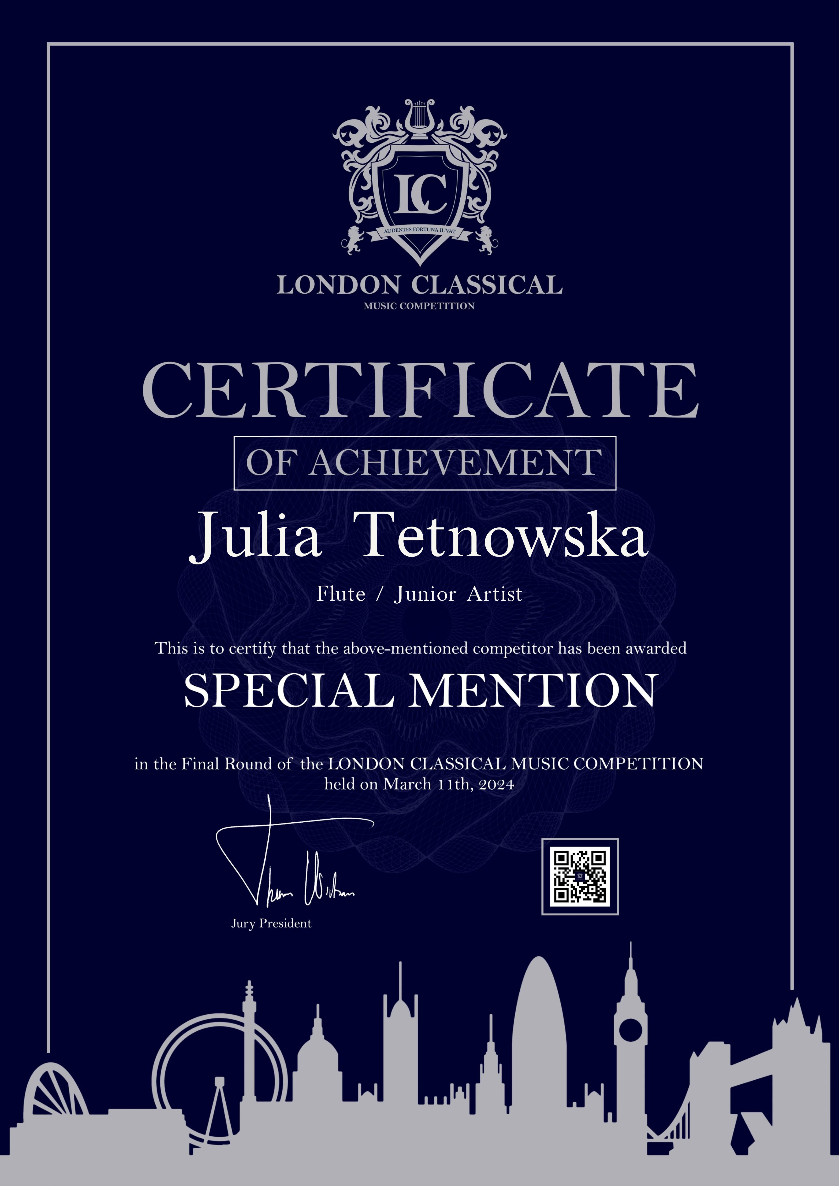 Z ogromną radością radością informujemy, że Julia Tętnowska uczennica z klasy fletu Pani Magdaleny Margańskiej-Dec zdobyła wyróżnienie podczas London Classical Music Competition (Londyn, 11 marca 2024 r.)