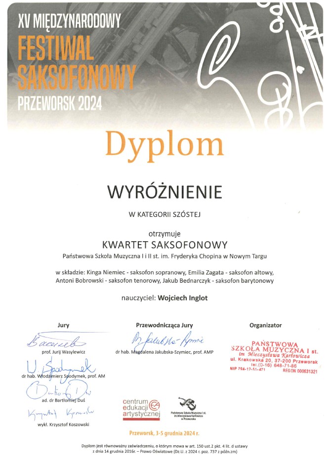 WYRÓŻNIENIE dla 🎷Kwartetu Saksofonowego 🎷z klasy Pana Wojciecha Inglota podczas XV Międzynarodowego Festiwalu Saksofonowego, Przeworsk 2024