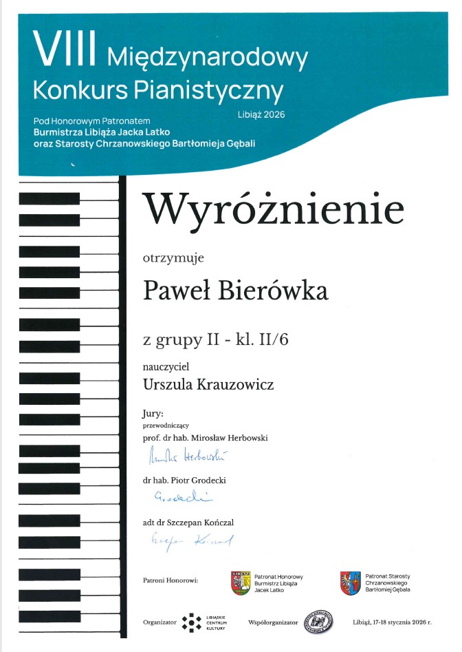 Serdeczne gratulacje dla Pawła Bierówki za zdobycie wyróżnienia podczas VIII Międzynarodowego Konkursu Pianistycznego w Libiążu! 🎶