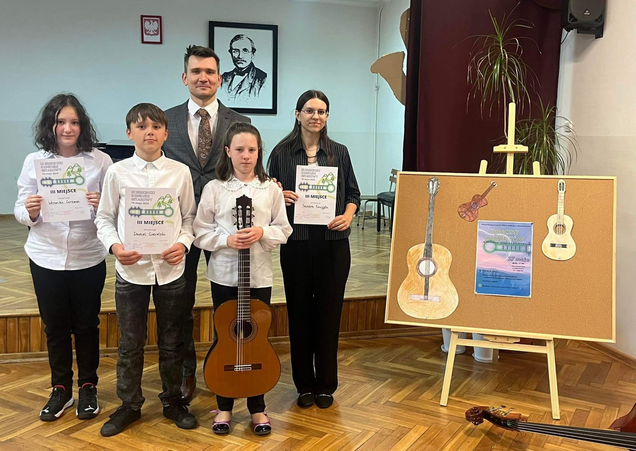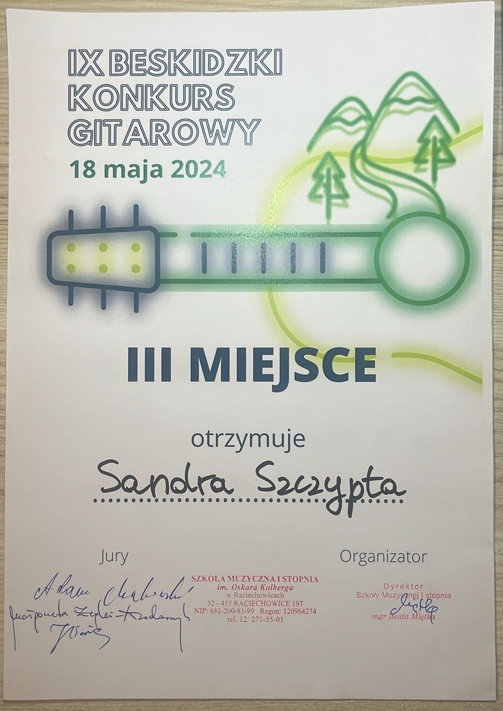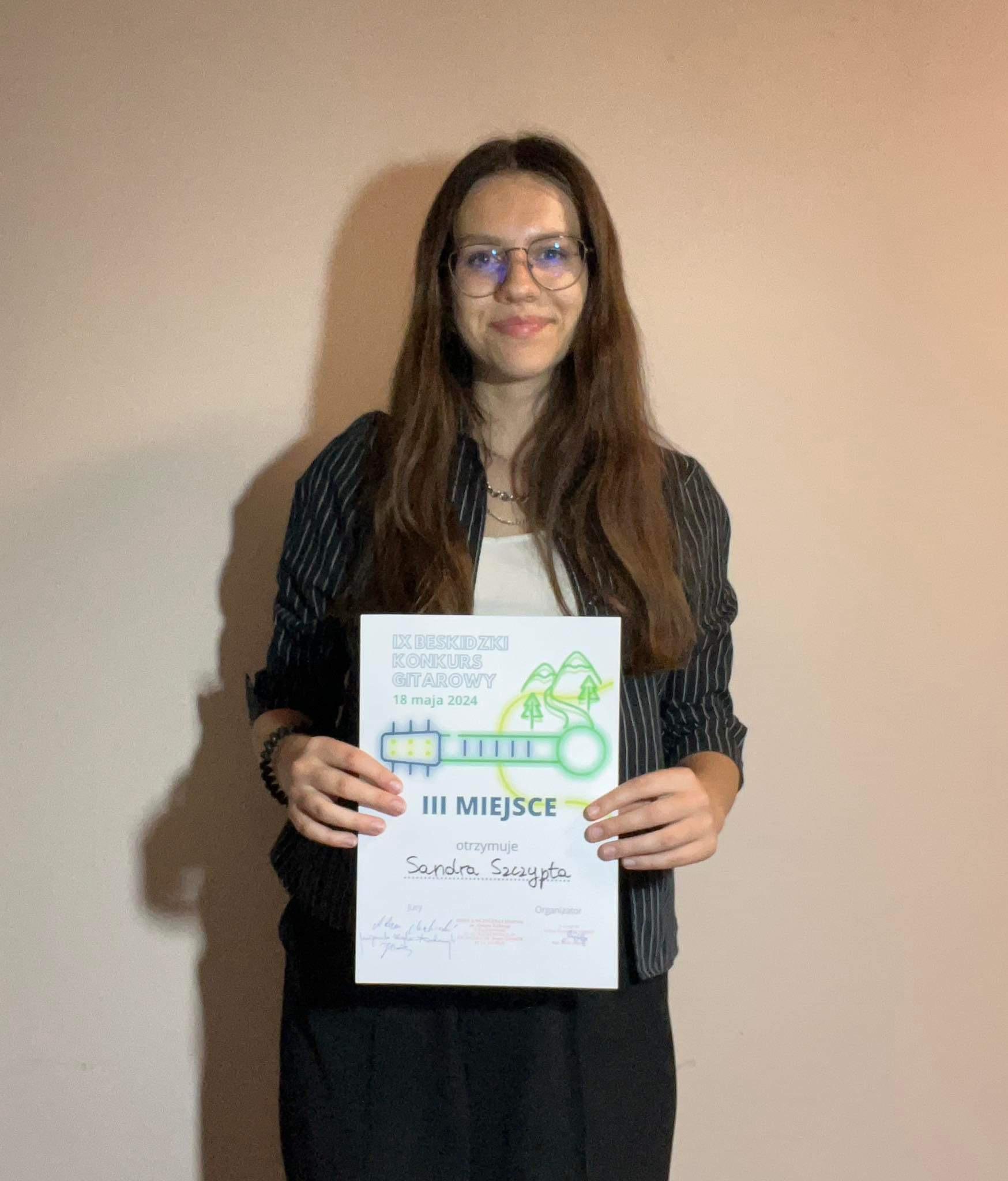 Sandra Szczypta, uczennica z klasy gitary Pana Adriana Furmankiewicza, zdobyła III miejsce podczas IX Beskidzkiego Konkursu Gitarowego w Mszanie Dolnej (18 maja 2024 r.)