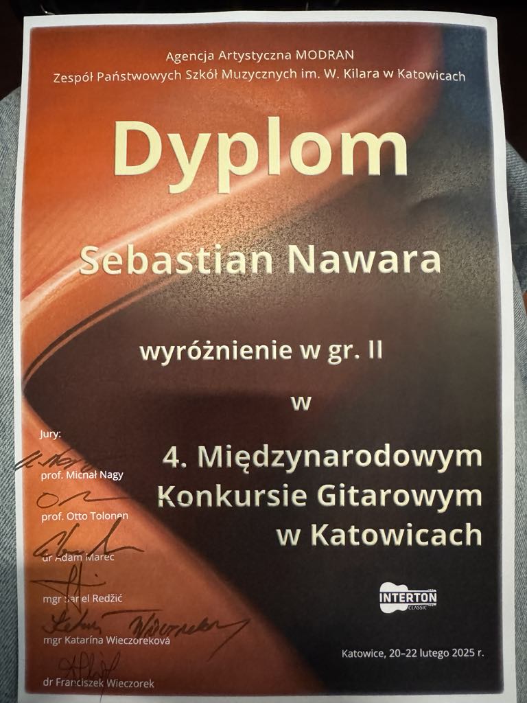Sebastian Nawara, uczeń z klasy gitary Pana Adriana Furmankiewicza, zdobył wyróżnienie w grupie II podczas IV Międzynarodowego Konkursu Gitarowego w Katowicach (20-22 lutego 2025.)!!!