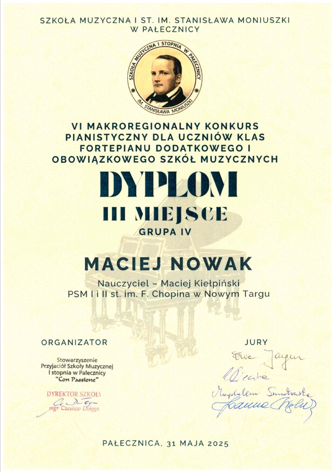 Głębokie gratulacje dla Macieja i Sebastiana za ich znakomite występy i zdobycie III miejsc! Wasz talent, ciężka praca i poświęcenie zostały pięknie nagrodzone. Jesteście prawdziwymi ambasadorami Państwowej Szkoły Muzycznej I i II stopnia im. Fryderyka Chopina w Nowym Targu. Życzymy Wam dalszych sukcesów i niesłabnącej pasji do muzyki!