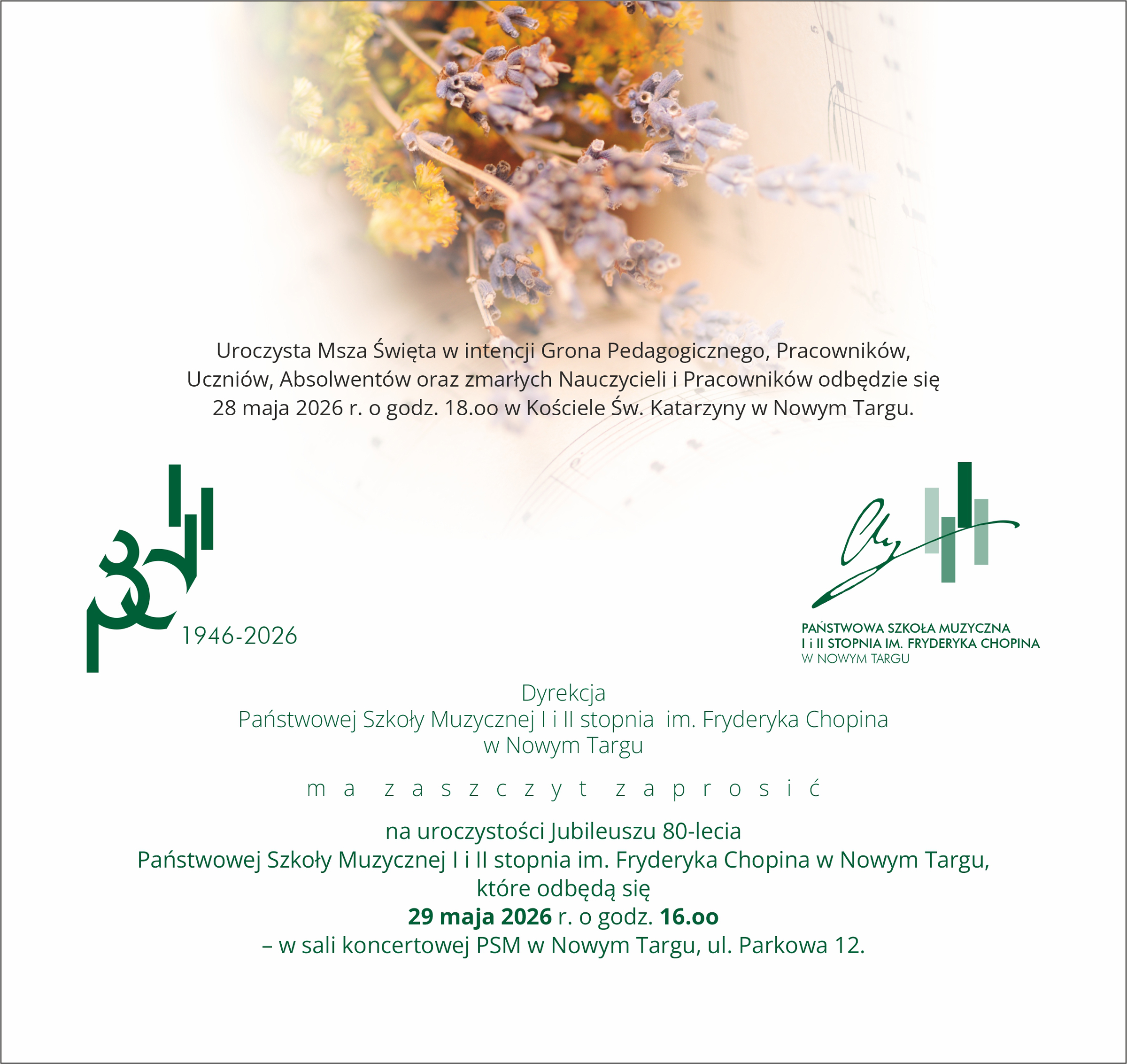 Dyrekcja Państwowej Szkoły Muzycznej I i II stopnia im. Fryderyka Chopina w Nowym Targu ma zaszczyt zaprosić Państwa na uroczyste obchody Jubileuszu 80-lecia istnienia naszej placówki (1946–2026).