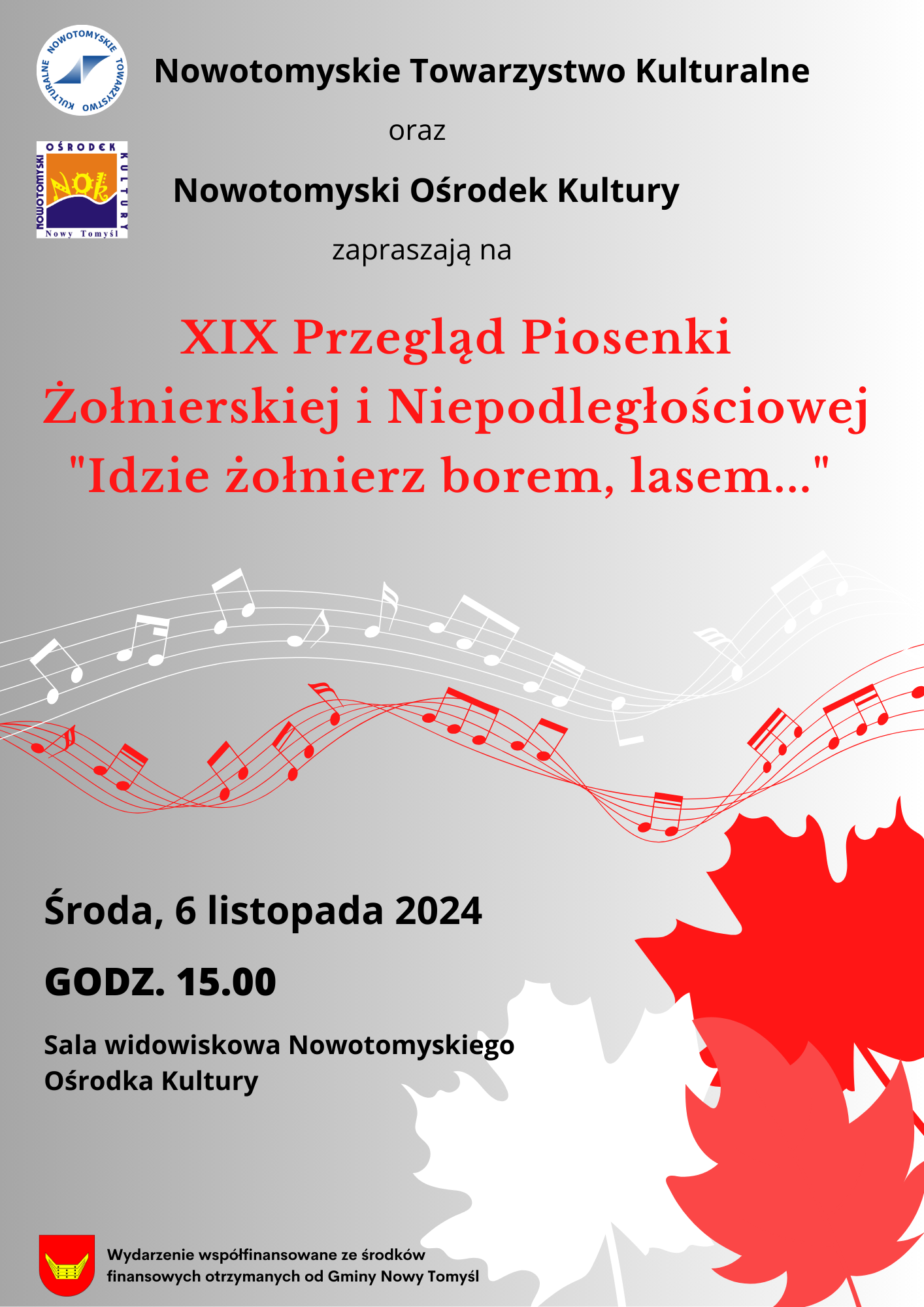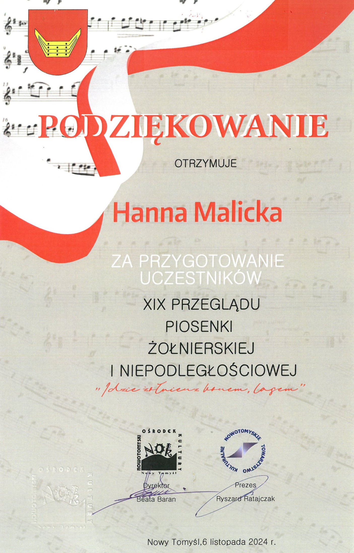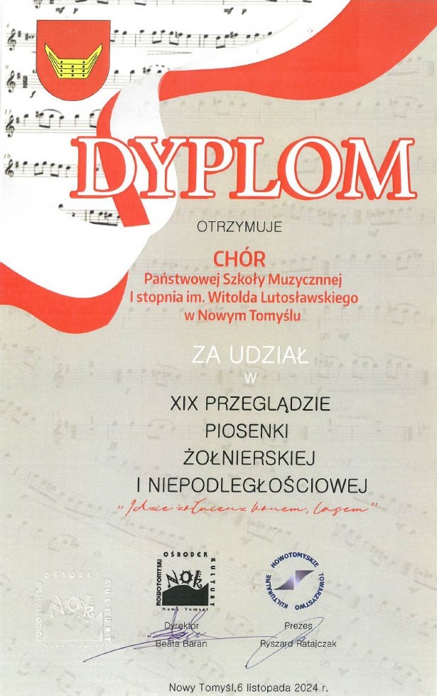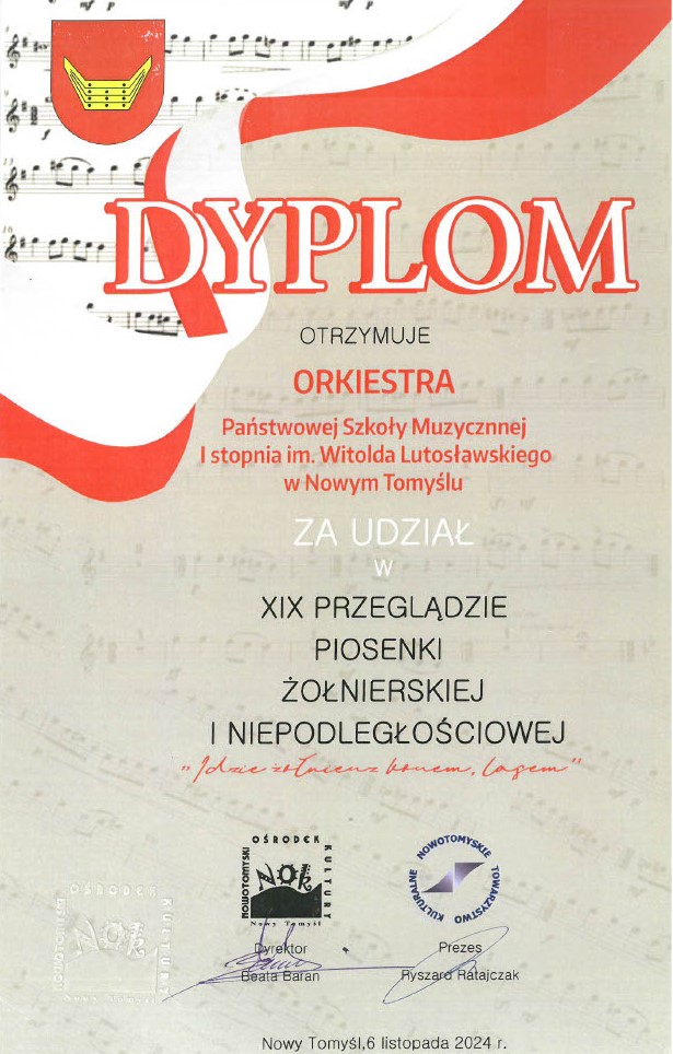 6 listopada 2024r w sali Nowotomyskiego Ośrodka Kultury odbył się „XIX Przegląd piosenki żołnierskiej i niepodległościowej”. W przeglądzie wzięli udział uczniowie z wszystkich szkół nowotomyskich i pobliskich gmin. Naszą szkołę reprezentowały w tym roku aż dwa zespoły – chór oraz orkiestra dęta, które stały się klamrą całego przeglądu.