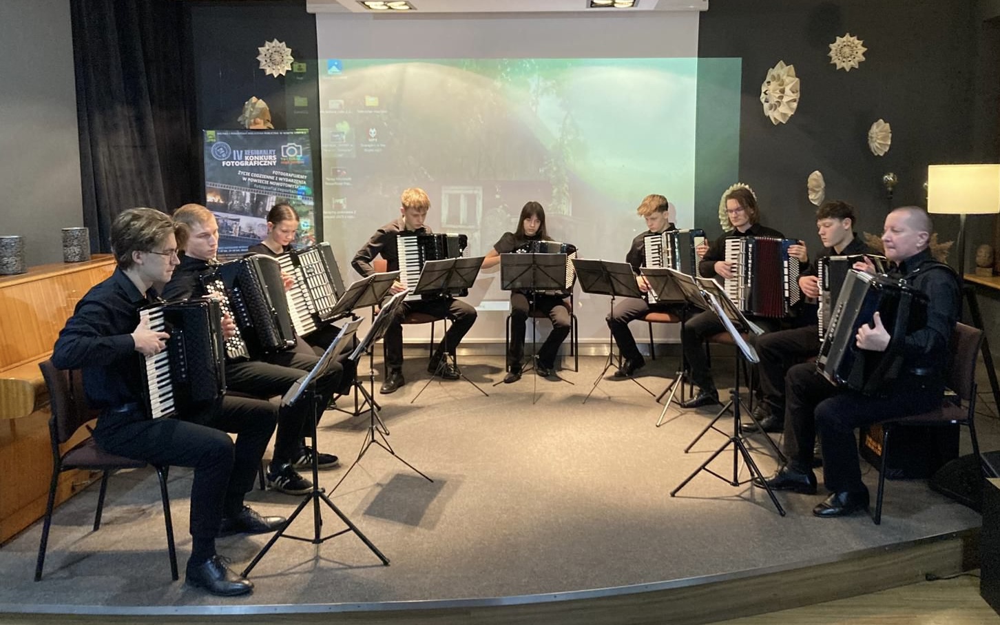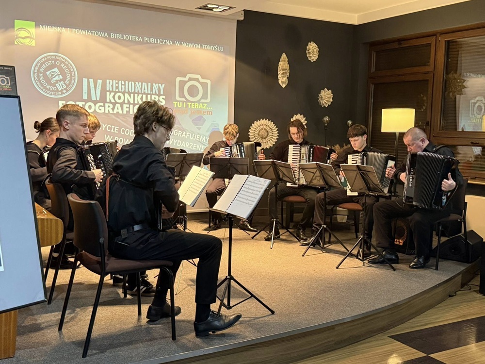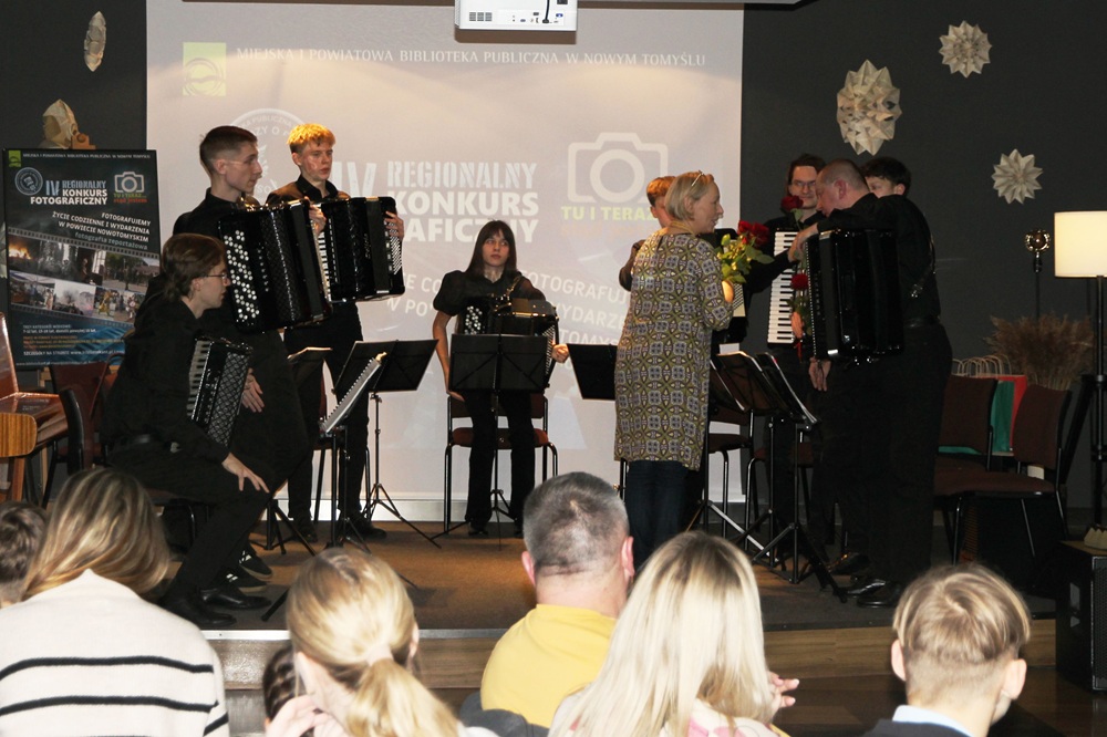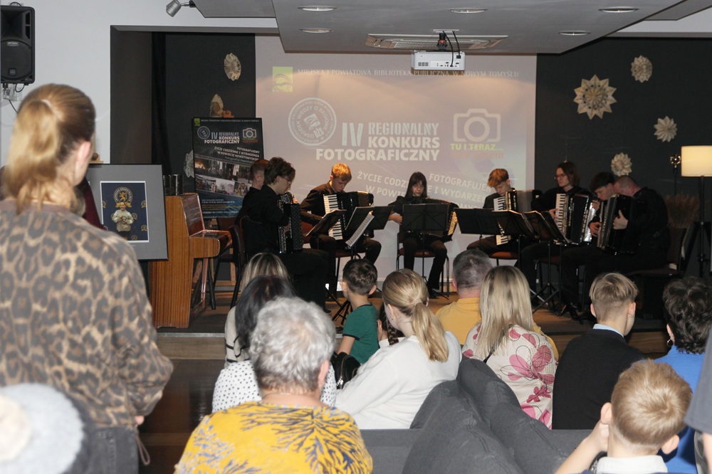 W poniedziałkowy wieczór, 8 grudnia 2025 r. w Galerii na Piętrze Miejskiej i Powiatowej Biblioteki Publicznej w Nowym Tomyślu Zespół Akordeonowy prowadzony przez Pana Tomasza Milera wystąpił podczas wernisażu IV Regionalnego Konkursu Fotograficznego „Tu i teraz… stąd jestem”, zorganizowanego przez biblioteczny Ośrodek Wiedzy o Regionie. Spotkanie zgromadziło licznych miłośników fotografii, autorów nadesłanych prac, Wiceburmistrza Nowego Tomyśla Adriannę Brzostowską, Starostę Nowotomyskiego Andrzeja Wilkońskiego oraz osoby zainteresowane dokumentowaniem życia regionu.