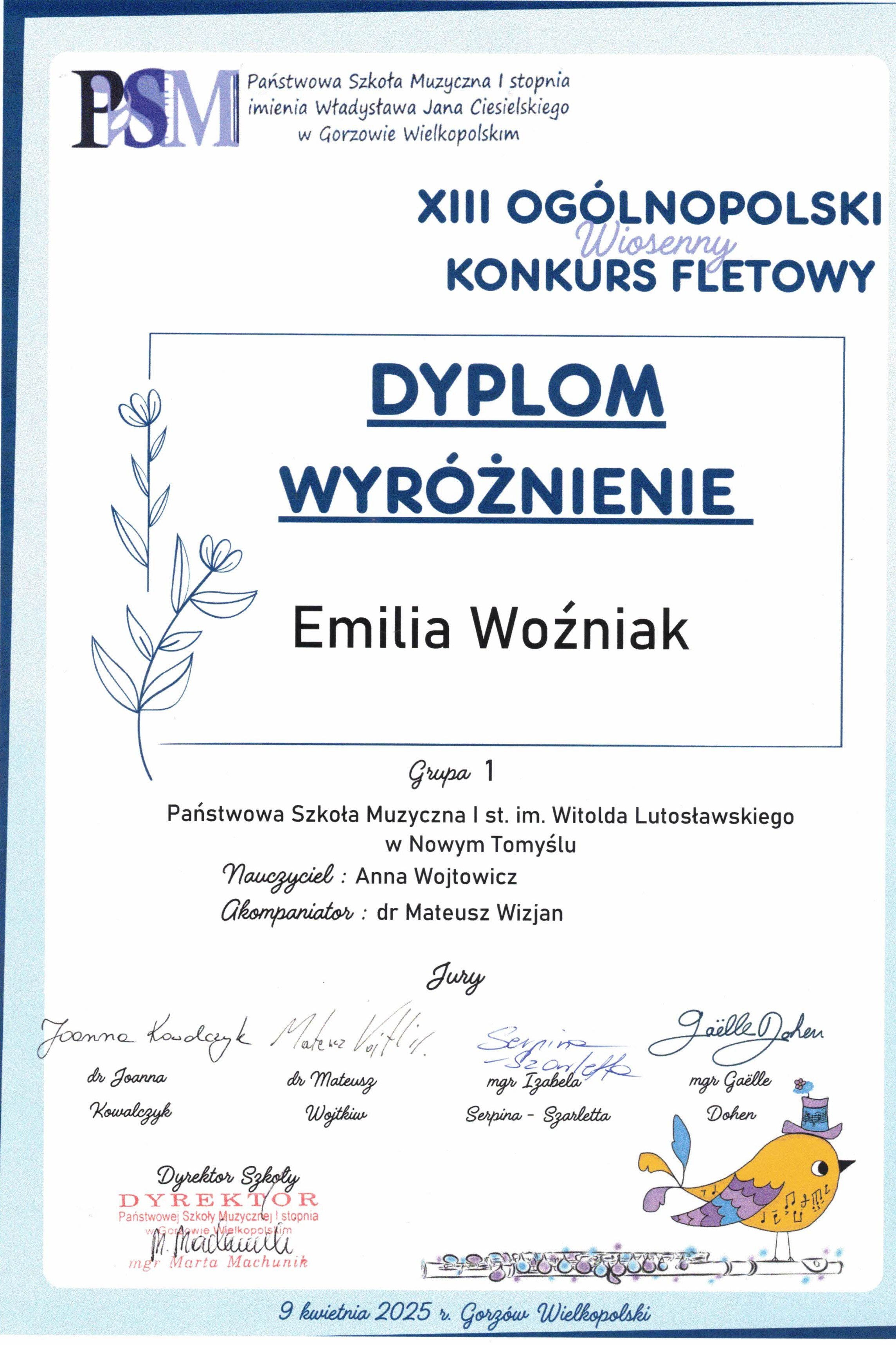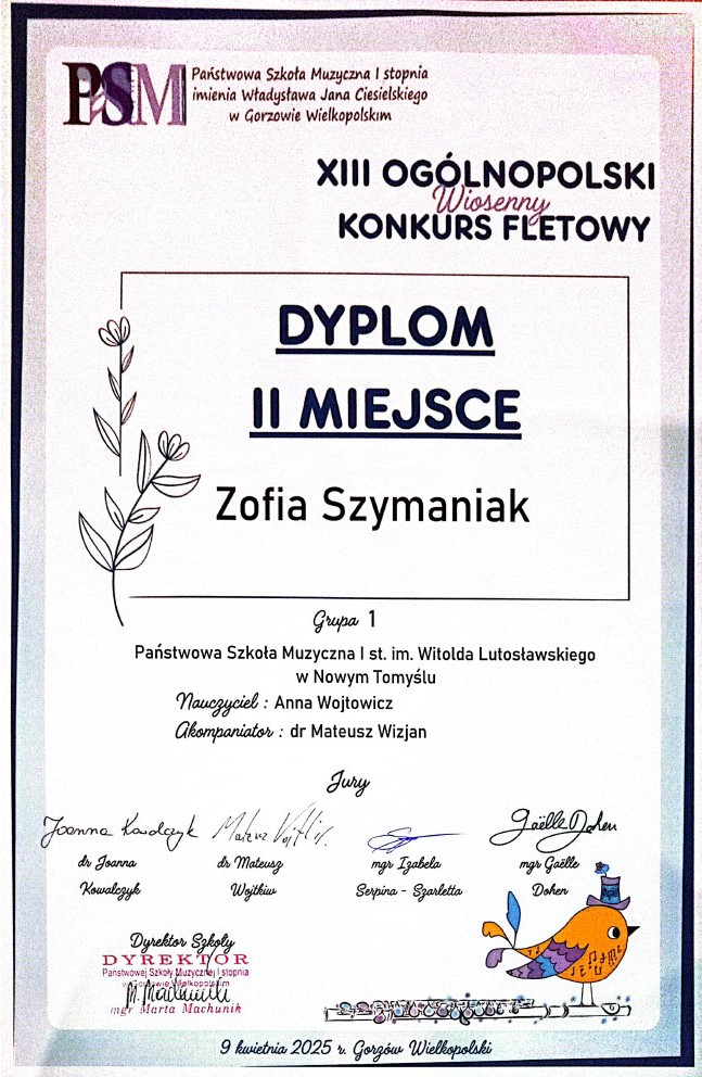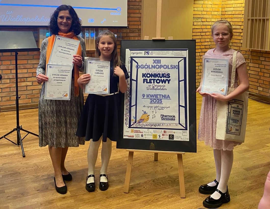 Z ogromną przyjemnością informujemy o sukcesie Uczennic klasy fletu mgr Anny Wojtowicz. W Minioną środę - 9 kwietnia 2025 r. Zofia Szymaniak kl. I c. 6 i Emilia Woźniak kl. I c. 4 wzięły udział w XIII Ogólnopolskim Wiosennym Konkursie Fletowym w Gorzowie Wielkopolskim. Przesłuchania odbywały się w sali kameralnej Filharmonii Gorzowskiej. Dziewczynki wykonały po dwa utwory z pamięci, z towarzyszeniem fortepianu. Naszym Flecistkom akompaniował dr Mateusz Wizjan. Dziewczynki pięknie reprezentowały szkołę. Zosia Szymaniak została laureatką II Miejsca w grupie I, a Emilka Woźniak otrzymała Wyróżnienie, w tej samej grupie.