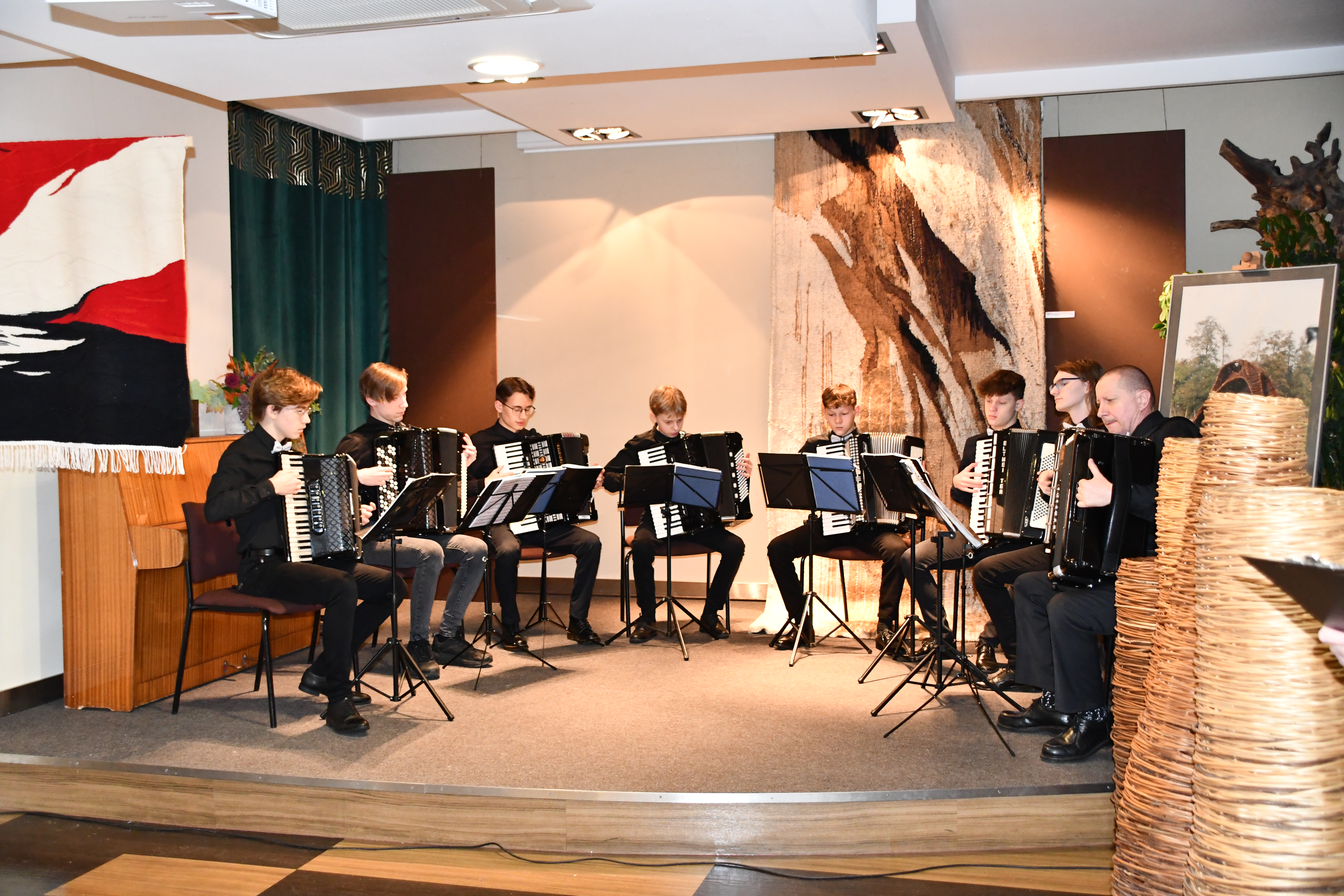 Występ Oktetu Akordeonowego z Państwowej Szkoły Muzycznej I stopnia im. Witolda Lutosławskiegow Nowym Tomyślu w dniu 12 stycznia 2023 r. na wernisażu wystawy ,,Od wikliny do tkaniny” w Nowotomyskiej Miejskiej i Powiatowej Bibliotece Publicznej.