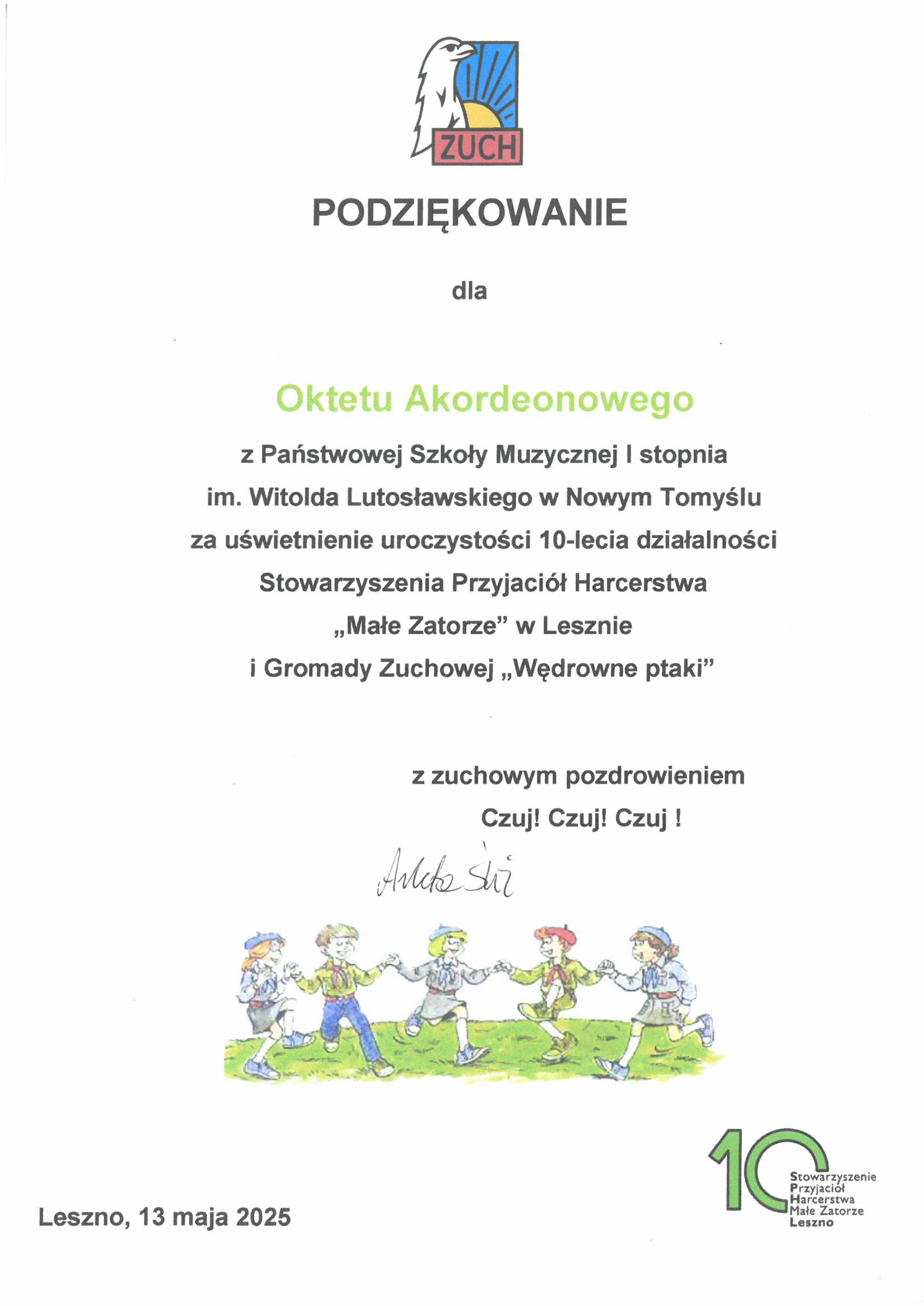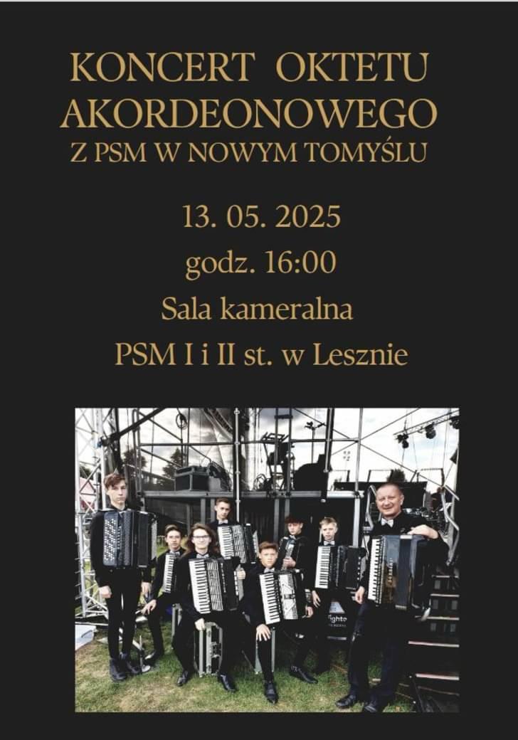 13 maja 2025 roku Oktet Akordeonowy prowadzony przez Pana Tomasza Milera koncertował w Lesznie. Na zaproszenie Pani Dyrektor i nauczycielki Pani Ireny Kaźmierczak prowadzącej klasę akordeonu wystąpił w sali kameralnej Państwowej Szkoły Muzycznej I i II stopnia im. Romana Maciejewskiego w Lesznie. Dla licznie zgromadzonej publiczności, którą tworzyli uczniowie i melomani muzyki akordeonowej zespół wykonał bardzo zróżnicowany stylowo program artystyczny. Koncert prowadziła kierownik sekcji instrumentów klawiszowych Pani Katarzyna Wojtkowiak. Drugim wydarzeniem tego dnia był występ oktetu podczas uroczystości 10-lecia działalności Stowarzyszenia Przyjaciół Harcerstwa „Małe Zatorze” w Lesznie.