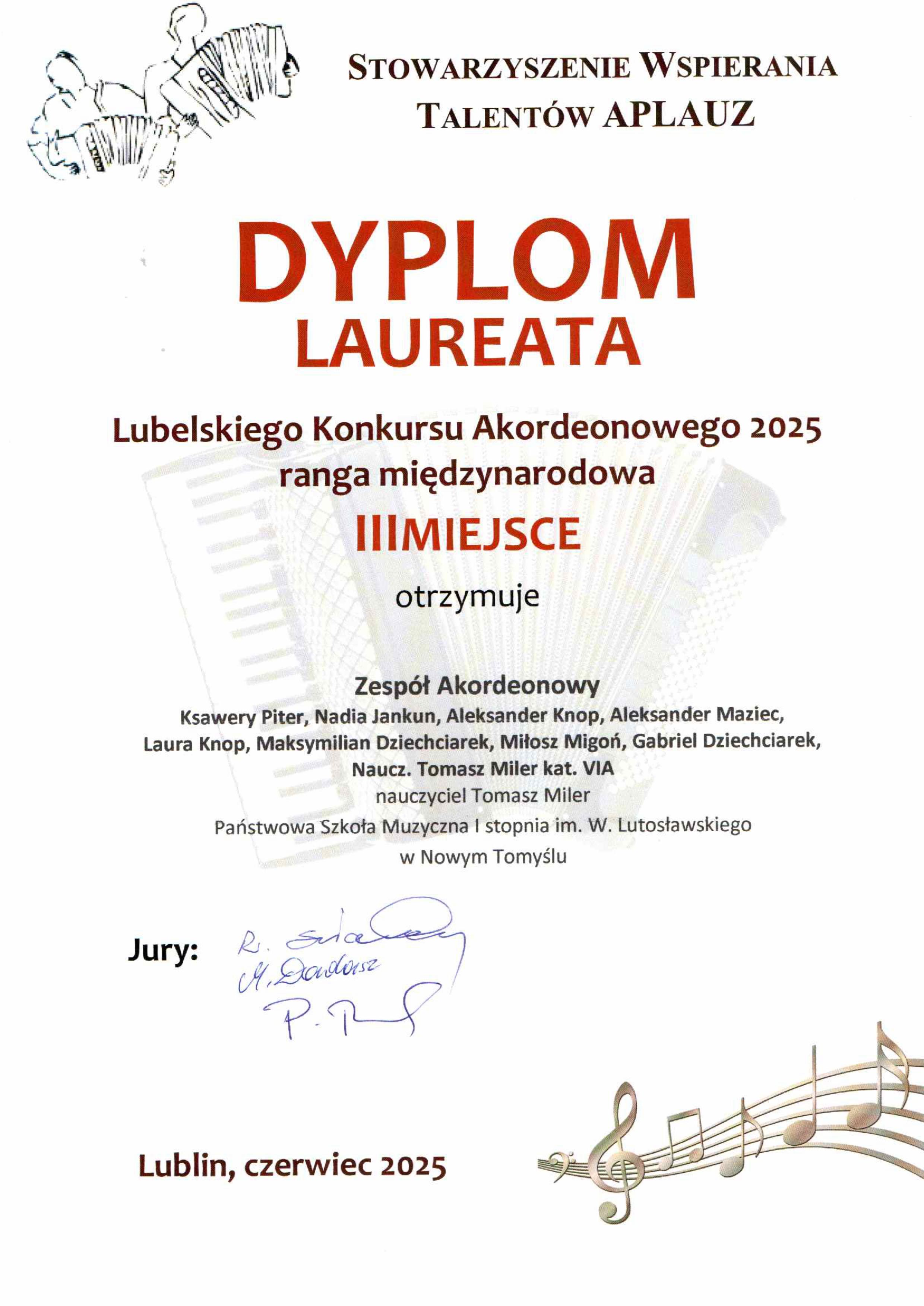Bardzo miło jest nam poinformować o sukcesie konkursowym Zespołu Akordeonowego prowadzonego przez Pana Tomasza Milera, który za nagrany program artystyczny otrzymał Dyplom Laureata III miejsca na Lubelskim Konkursie Akordeonowym.